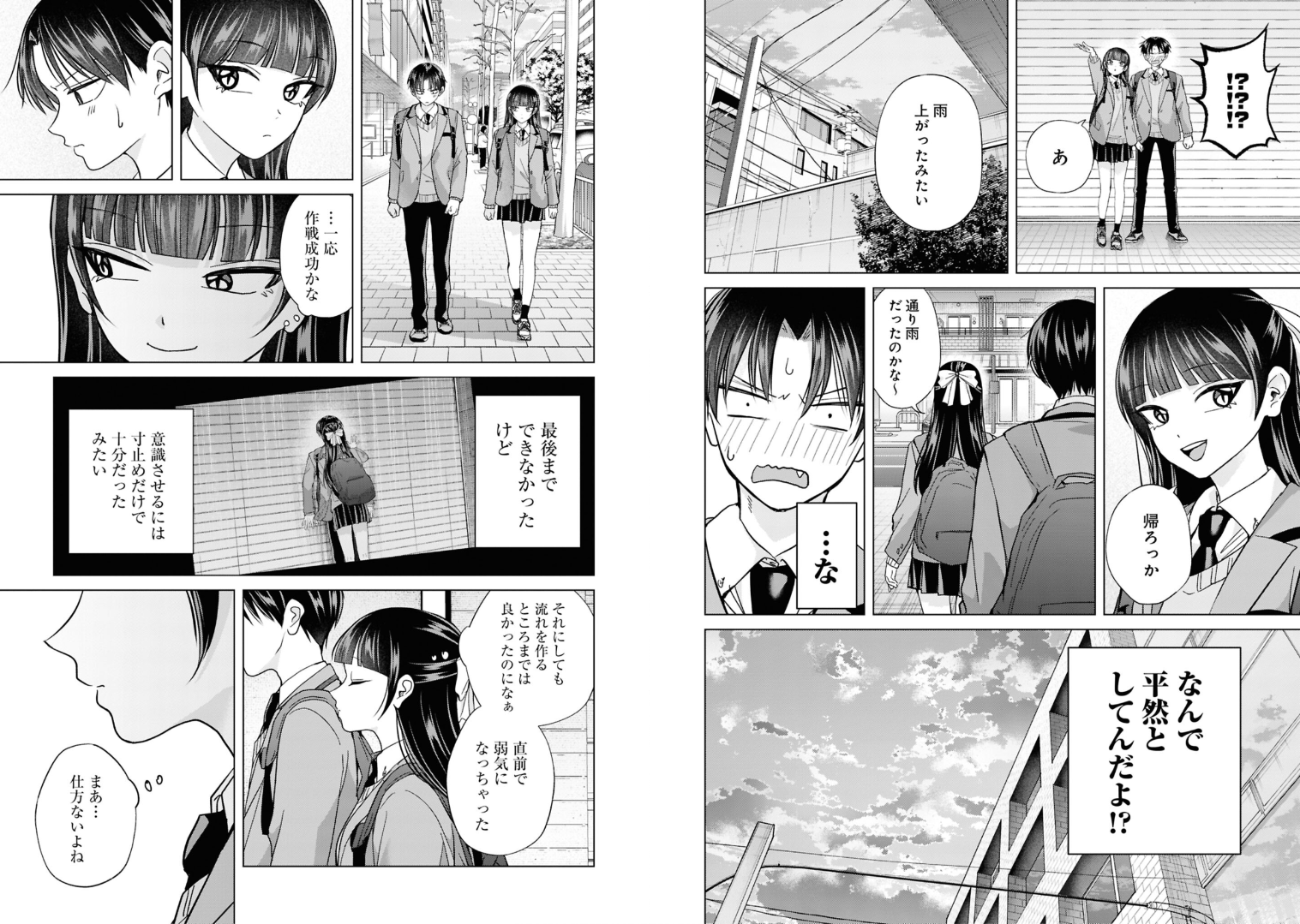 >>285611276>“!?”>“Ah. Looks like the rain stopped.”>“Shall we head home?”>“I guess it was just a passing shower.”>“W-Why are you acting so calm about this!?”>“…I guess the plan worked, at least.”>“We didn’t go all the way, but Stopping just short was enough to make him conscious of it.”>“Even so, things were going so well up to that point... I lost my nerve right at the end.”> “Well… it can’t be helped.”