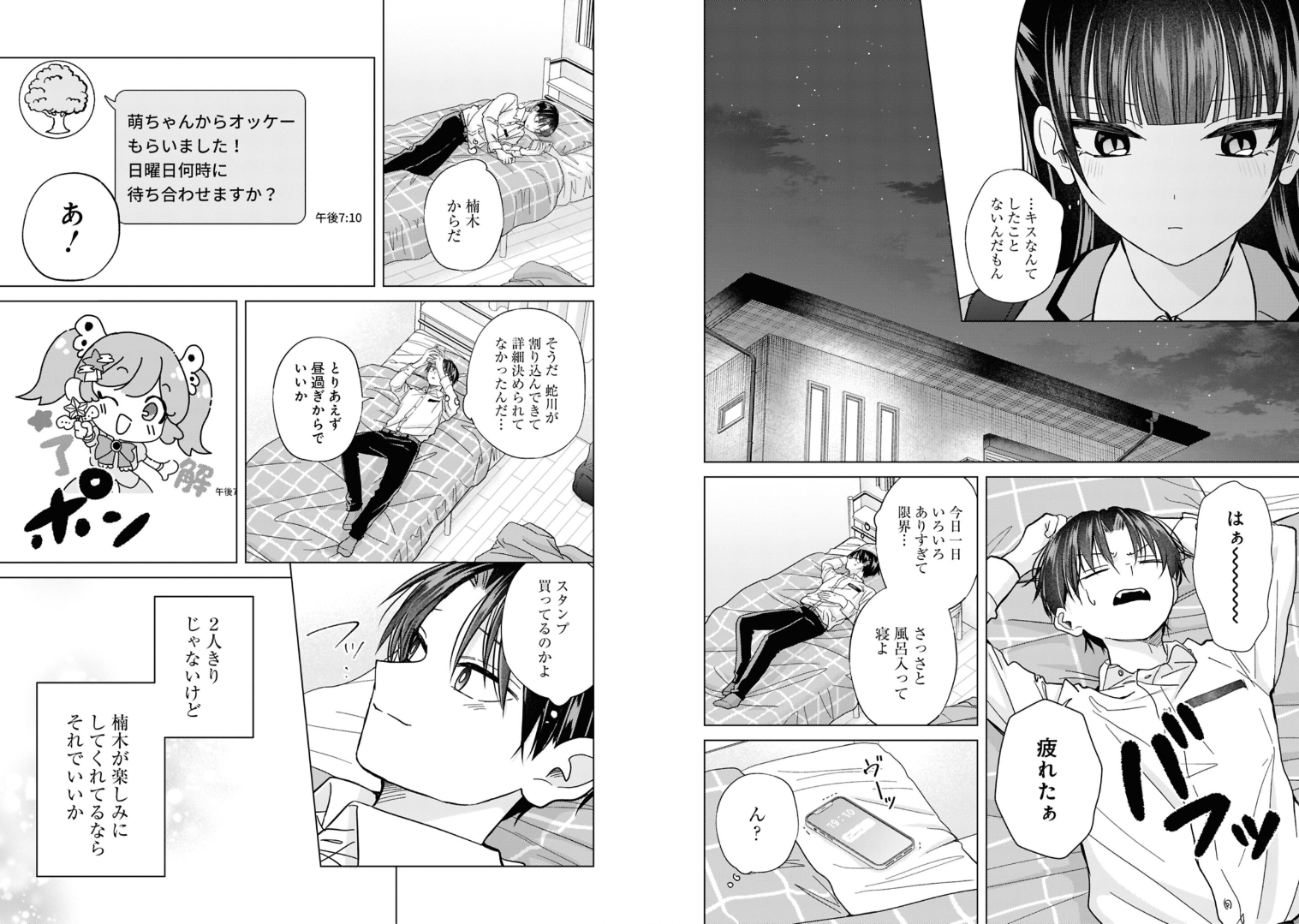 >>285611399>“…It’s not like I’ve ever kissed anyone before.”And that's it for Hebikawa in this chapter, i'm sorely disappointed but this is merely the tip of the iceberg of my disappointment>“Haaah… I’m exhausted.”>“Too much happened today… I’m at my limit…”>“I’ll just take a quick bath and go to sleep.”>*buzz*>"It's from Kusunoki">“I got the OK from Moe-chan! What time should we meet on Sunday?”> “Right—Hebikawa interrupted us, so I never got to explain properly.”>“For now, afternoon should be fine.”>*sticker reply*>“She’s really buying stickers, huh…”>“It won’t be just the two of us, but… If Kusunoki’s looking forward to it Then that’s enough for me.”