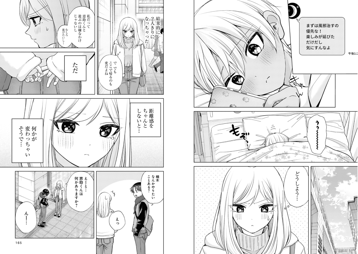 >>285611677“First priority is getting over that cold! The fun’s just been postponed, so don’t worry about it.”>“Ughhh…”>“What should I do…?”>“In the end, it turned into just the two of us…”>“B-but maybe this is something I can still change…”'>“It’s not that I dislike hanging out with people who are ‘bad’, If anything, I kind of want to…”> “But if we don’t keep proper distance… It feels like something might change…”>“Hmm…Kusunoki, is there anything you’d like to do?”>“Um… Keisuke, is there anything you want to do?”I'm not sure if I get the proper reading for the 2nd page of kusunoki's upper left corner panel but eh