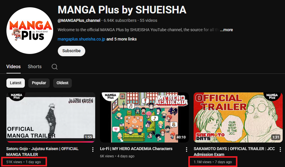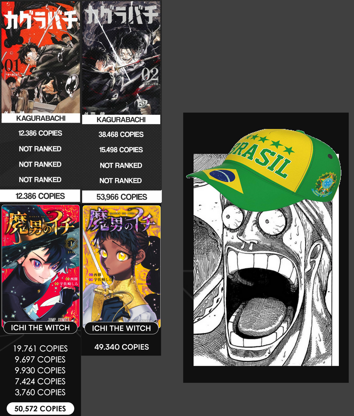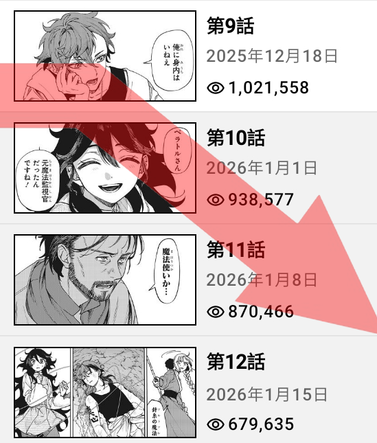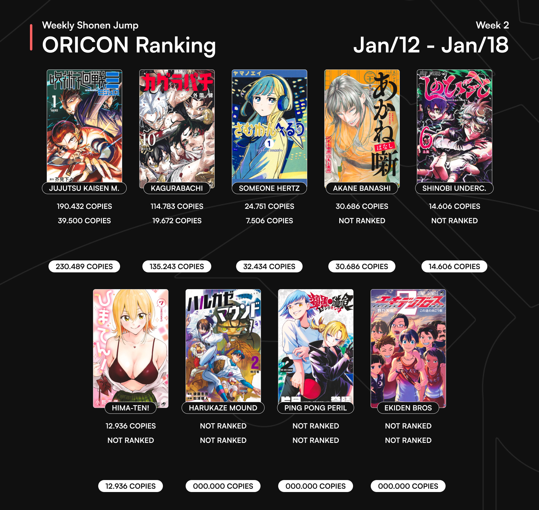 7. Jujutsu Kaisen Modulo #1 31. Kagurabachi #10 (11,282 / 146,525) 47. Someone Hertz #1 (7,802 / 40,236) 196. Akane-banashi #20 (2,958 / 39,801) 432. Shinobi Undercover #6 (1,354 /18,632)