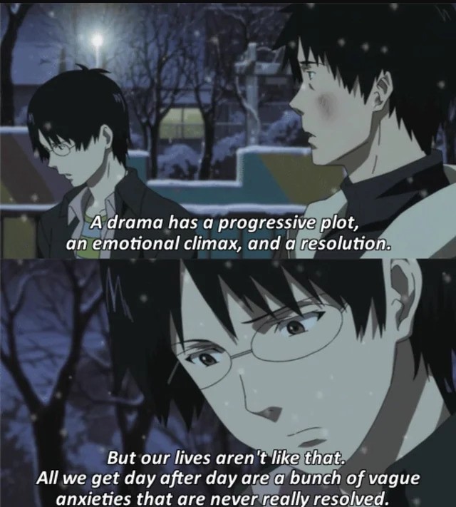 >>285648512this is one of my favorite quotes from anime or media in general. I feel like this perfectly points expresses something that I feel makes me highly incompatible with people and the world in general. I like stories and art better because they're "perfect" in a sense that everything flows together around a central message or idea. when characters interact in a story there's meaning behind all their words, and everything that has meaning in the story is bound to be addressed at some point (unless the author sucks).but in the real world practically everything is decided by the whims of chaos. the most important thing in your life may or may not work out based on some trivial bullshit, and people communicate in barely organized nonsense and rarely to never say anything that actually matters. nothing is predictable because everything is influenced by random factors outside your ability to perceive or control. and if you love anything or anyone you have to brace yourself constantly for it to be pulled out from under you at any time for no reason in particular.it's hard to care about anything that isn't fantasy. no wonder a lot of us stop bothering.