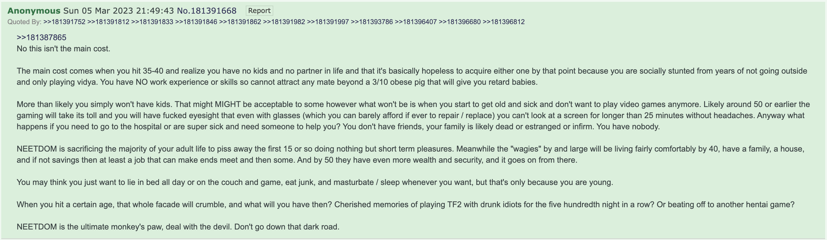 >>28565389639 now, and going on the 11th year of the current NEET stretch. Had a job and girlfriend for at least a few years before that. Just not built to be a normalfag or be able to even larp as one, never was, never will be.