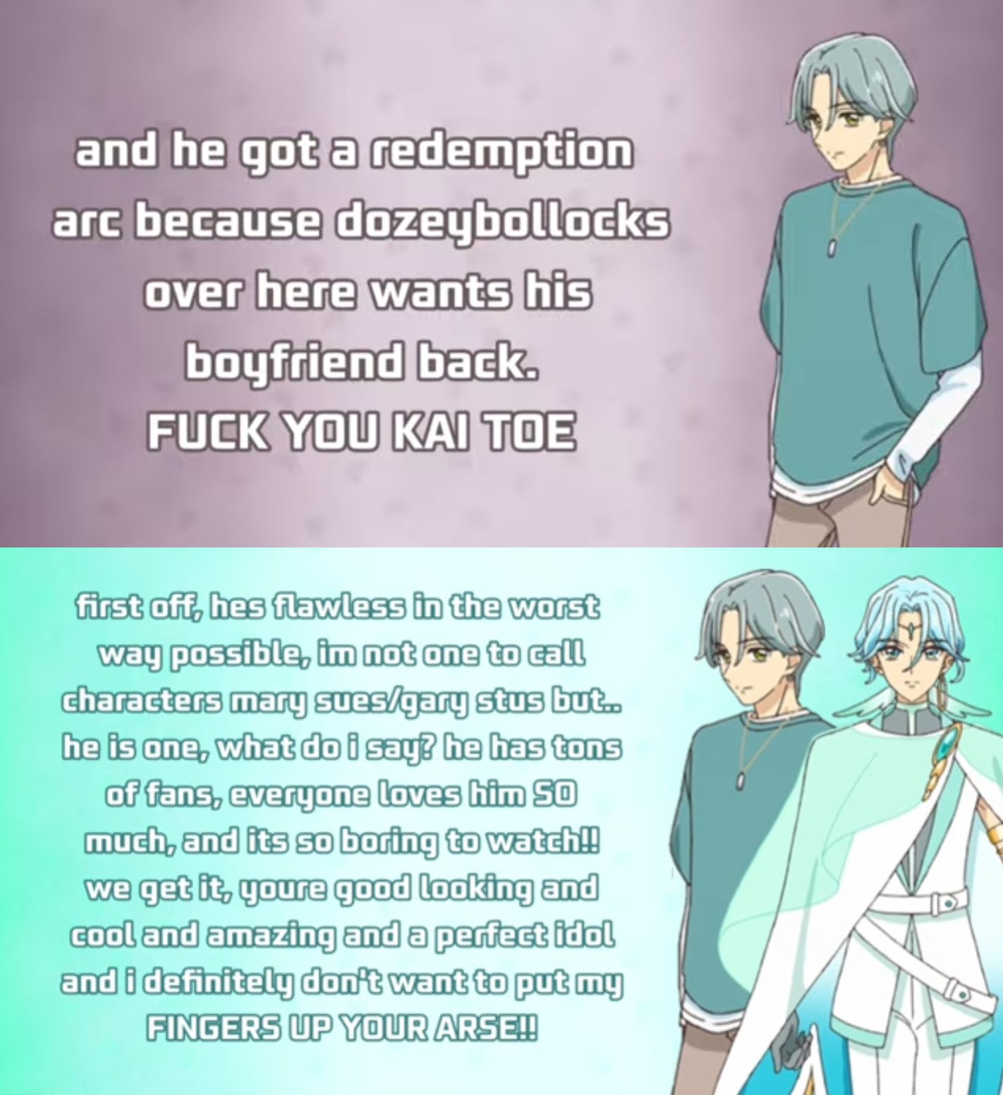 Seeing hetcucks getting cucked by two gay men in the last minutes of the last episode after investing their whole year in their precious #KaitoUta was the most hilarious thing I've seen in years.