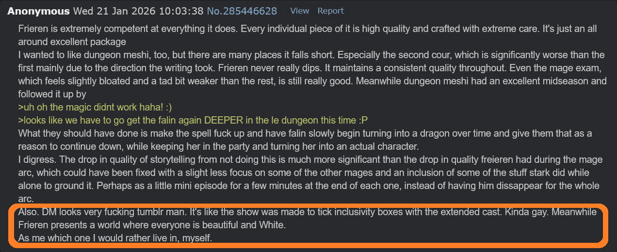 >>285678772It's the exact opposite: DM is for elite patricians with refined tastes. It's had dedicated, hardcore readers for ages, long before Frieren was known for shit. The kind of posters who've read and watched a lot, and not only that, but have a desire to plumb the depths of stories more completely. Frieren is for tourists: the unwashed masses who just go "wow, cool anime, hey have you seen this cool show called Ghost in the Shell?" The people who don't engage with the medium enough to have more nuanced interests or a deeper level of interest in the stories and work.Not that this makes Frieren bad or DM good, but just that it's clear Frieren's audience is found among the general, casual readership and Dungeon Meshi's audience has always been the more niche and dedicated one.