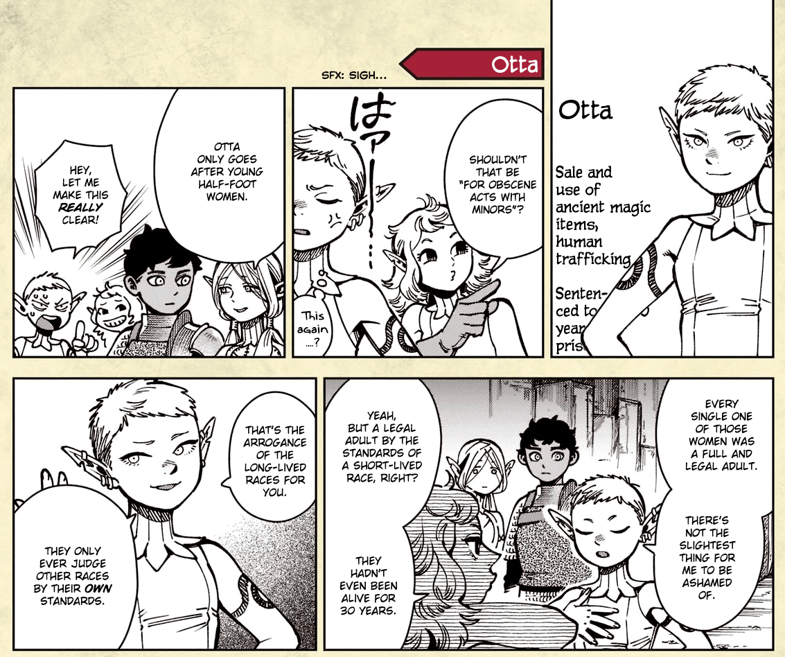 >>285663742They're not storming off because of that. The joke is that they're leaving in the middle of him trying to explain why things are fine because they weren't paying attention: they were too shocked by his revelation that his biggest wish, the one the Demon cursed him not to experience, is just that he wanted to be eaten by animals.It's like the bit where they were trying to figure out how to tell him that his greatest wish was probably not that Falin would be recovered. Only here, it's Laios once again making them realize how much they underestimated his weirdness and leaving in a huff over getting so invested in things.