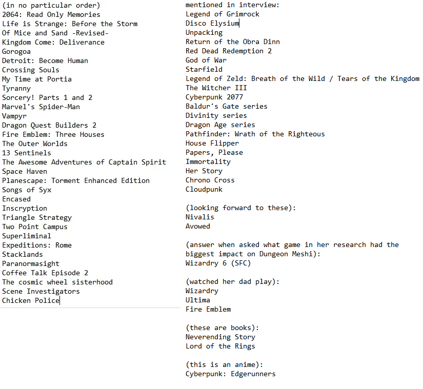 >>285735702>How would you make a Dungeon Meshi game?Rogue-like JRPG mixed with financial management and survival mechanics. You start out with a core group of three and hire or recruit more members and delve in to collect riches. If you get wiped you lose everything you brought and have to pay corpse recovery fees. You have to know what areas are safe for your skill level, how long you can trek with your supplies and when to turn back and bank your rewards because without a good stash, one bad wipe can screw you. Also no level system that make you go from 300hp early game to 5000hp late game, sure you can improve characters fighting skill, magic, trap detection and such but defense comes from buying better shields and armor or learning to perry. The tough part of the game is that it is very unforgiving of failure, without money most of those party members who you've trained up will leave, without good equipment you stand no chance against later monsters. Basically avoid being a Kabru. Also be careful about delving too deep and attracting the Dungeon Master or worse... the Demon. Everything that you desire can be a curse as well.