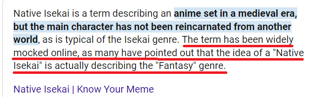 >>285731700I always felt weird because people use it like a buzzword but it's real. It's fantasy that has videogame elements in it without being an isekai. For example parties, character classes, skills, etc. It's the way the world is presented. The only thing that makes Isekai Isekai is the MC coming from our world to a different one, but in practice all of them have videogame elements (some more than others). When regular fantasy has such videogame elements people call it native isekai. The name of the term might be dumb but what it refers to is real.
