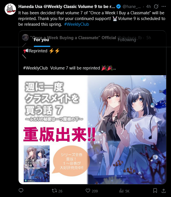 >「週に一度クラスメイトを買う話」の更新ですが、いろいろありまして明日(1月31日)になる予定です。