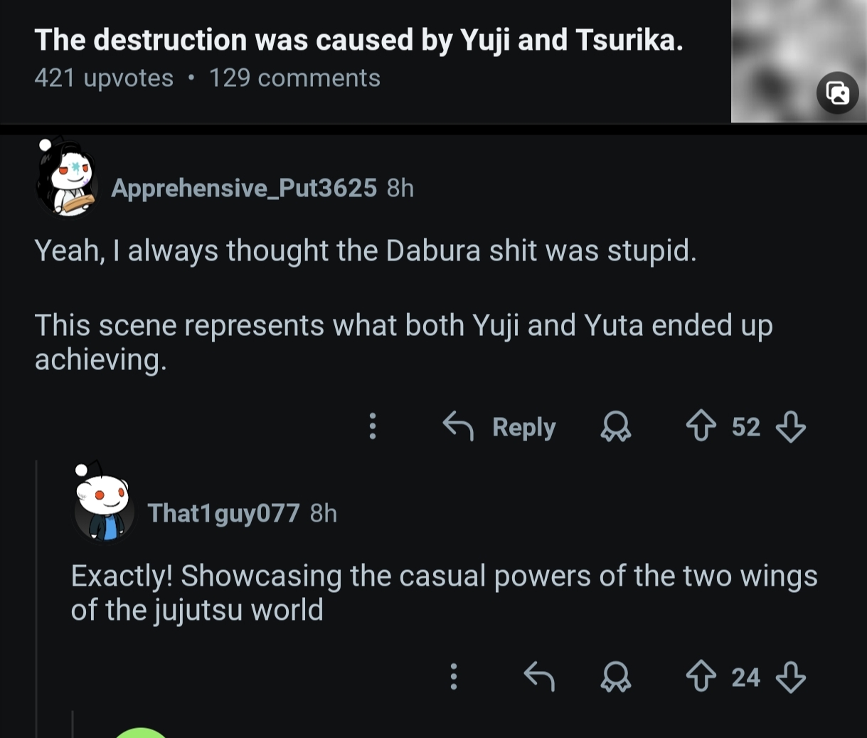 >>285680233>Yuji is exempt from blame hereIf you have the power to act but choose not to, you take responsibility for the consequences of that decision.Obviously yuta is also at fault, but if it was gojo in his place he would have intervened.>>285680243>Yukas clan here sees both her and her brother as fully fledged membersEverything we see suggests otherwise, and yuka is treated with hostility compared to Tsurugi in literally every interaction we've been shown.Her being "allowed" to summon makora isn't charity, it's the clan continuing to be salty fuckers and solving two problems at once. If yuka had actually been able to refine her technique, she still would have died. But maybe if she had lived for another 15 years it's entirely possible that with a fully refined 10s technique she could have survived without killing herself