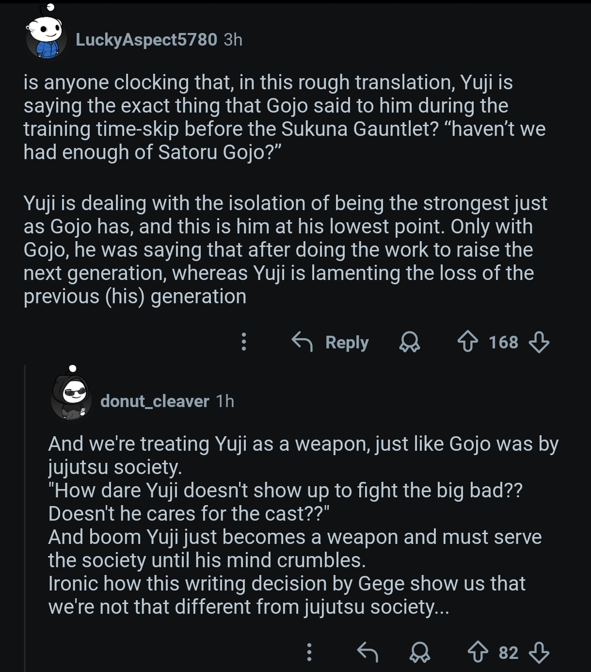 As a reminder, here are the amazing reasons why Jujutsu Society simply had to ritually sacrifice Yuka after one of them fucked up and caused the situation to escalate to this degree.>Curses will break out! (We'll have to actually do our jobs and get good!)>It will be a problem for the future generations! (We can't do our other job and resolve the crisis with diplomacy)If I were Yuji, I wouldn't pull up to wipe their asses after they shit themselves either, and winning the duel wouldn't even really solve anything in the first place. The only good thing to do here is to save Yuka, which he may very well do.>>285679990>When someone comes to him and complains that sorcerers are getting weaker and might not be able to support themselves, "it doesn't matter".We don't actually know the contents of that conversation. For all we know, it was "save yourself the trouble, people will only start worrying about things when a big problem appears, not before it".