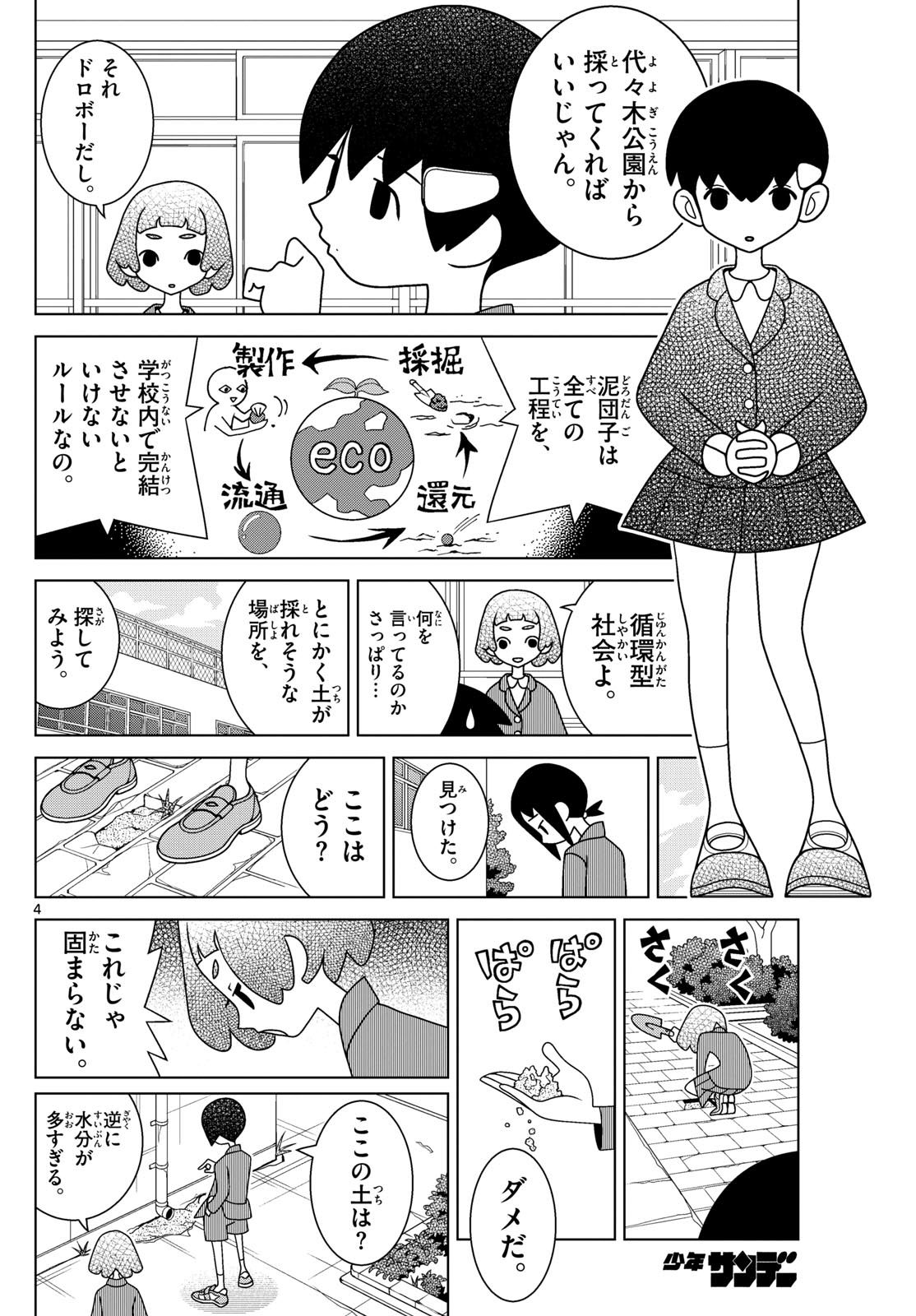 >Can't you take some soil from Yoyogi Park?>That would be stealing.>The rule is that the entire manufacturing process of mud balls>Counterclockwise from top right: Digging, shaping, distribution, return>must take place solely within the school grounds.>We're a recycling society, after all.>How is she saying this stuff with a straight face...>For now, let's try to find spots>where we might be able to get some soil.>I found one.>How's this?>No good.>It doesn't stick together properly!>What about this soil over here?>The opposite problem – it's too wet.