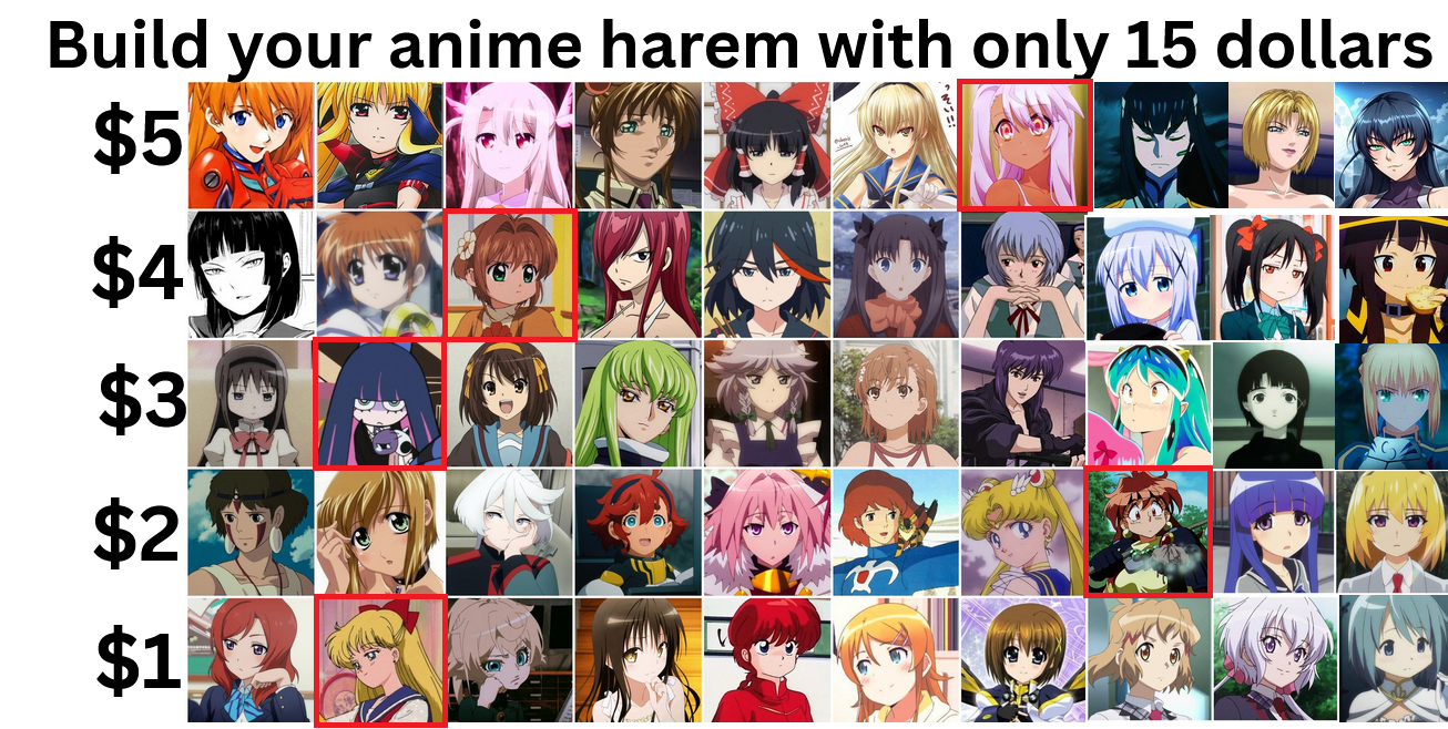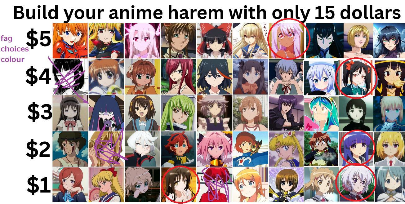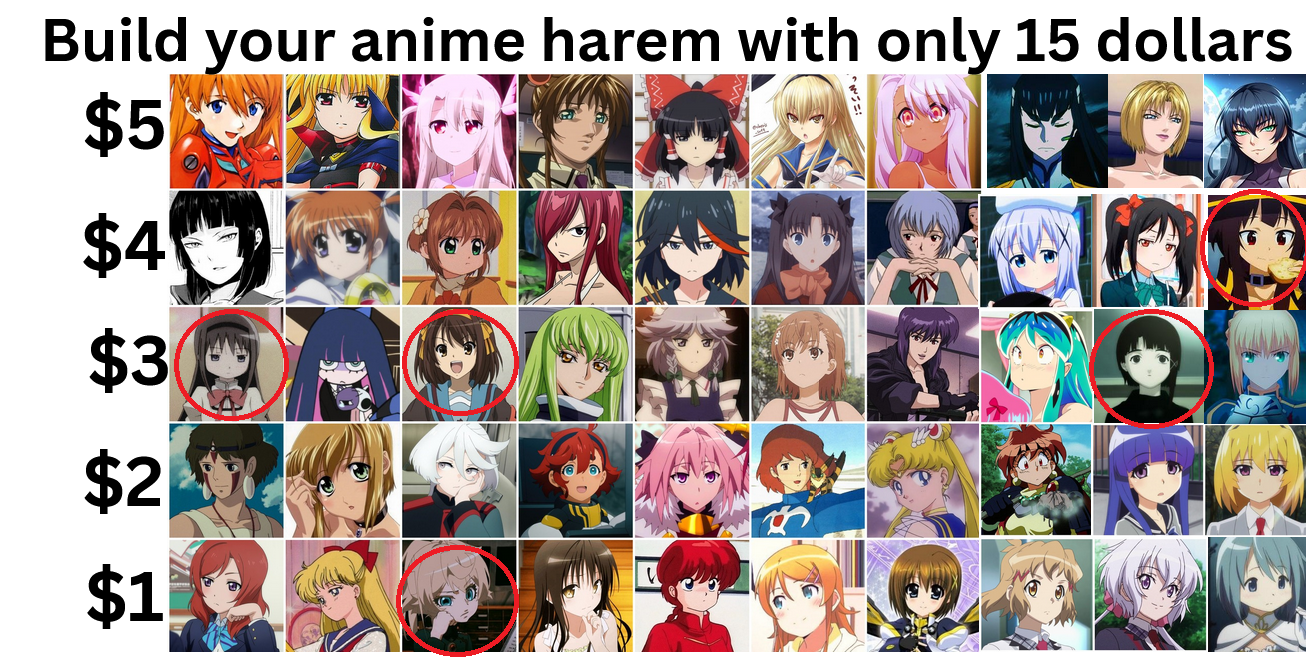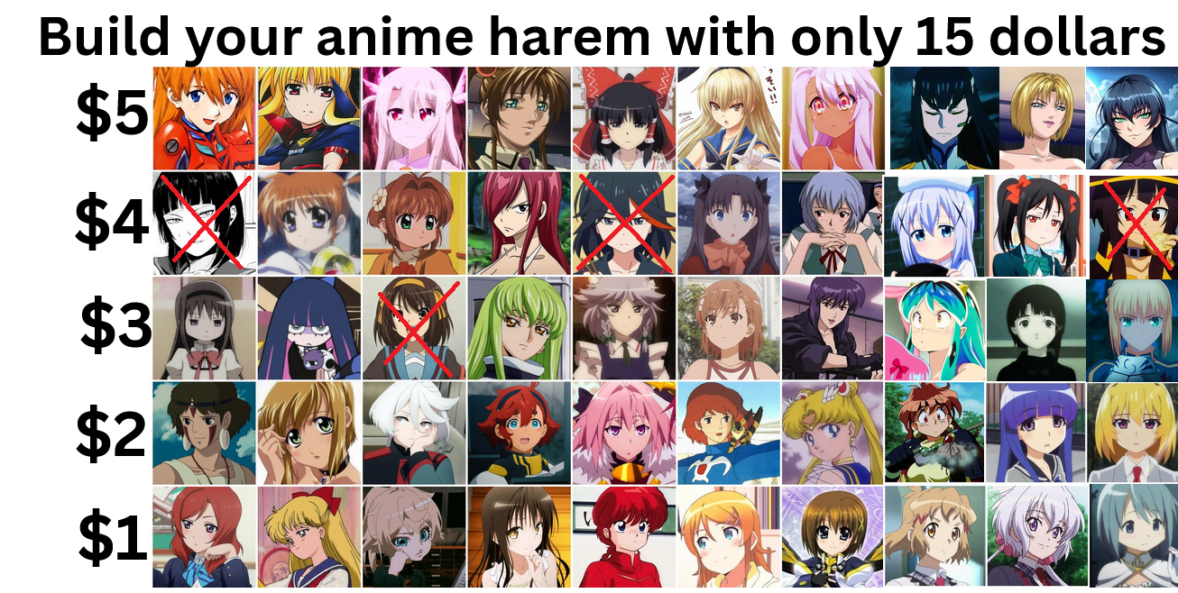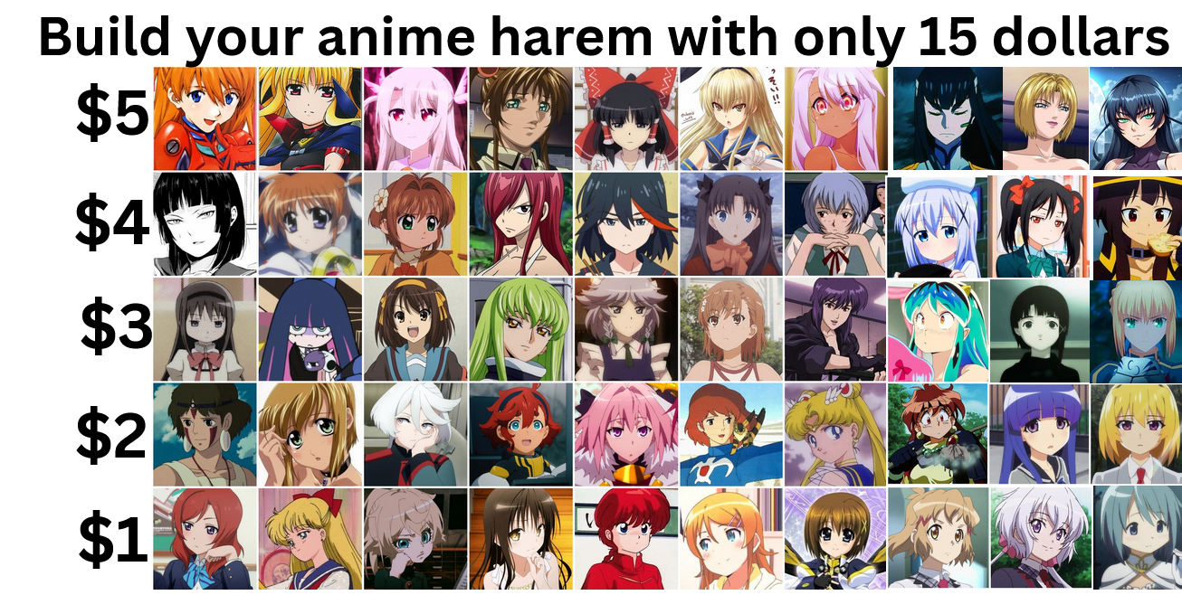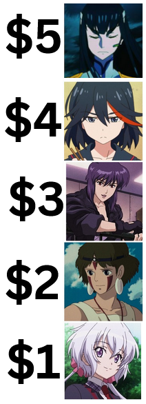 >>285712941well this is easy cause everyone in the 5 dollar category is fucking dogshit and two of them have dicks>$4Ryuko, Nico>$3Haruhi>$2San, Lina