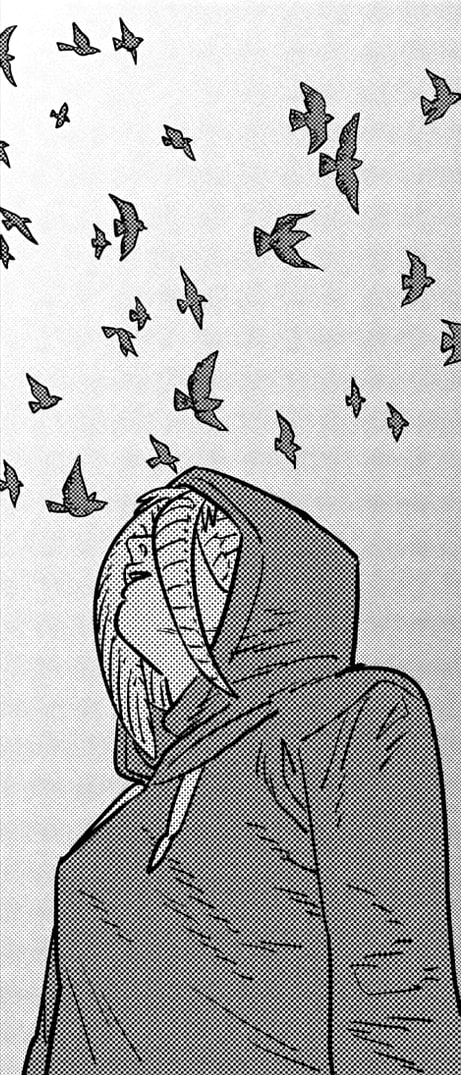>>285747510>Depth>Guy is just a hooded old bum playing pachinko while the kids are fighting and dying