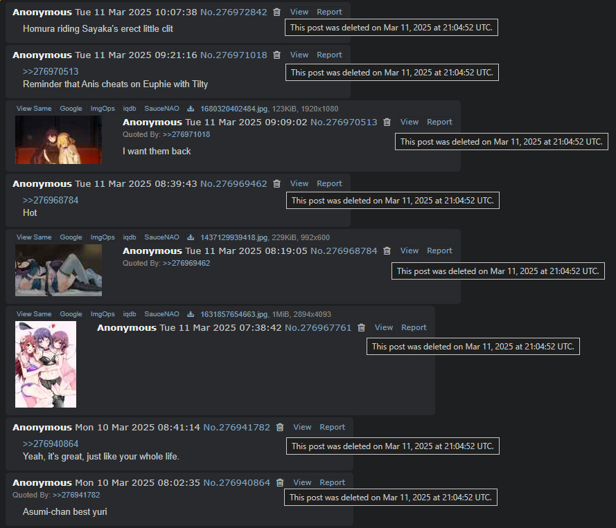 >>285799309Explain why you are spamming crack shipping garbage./a/ is not an image dumb board. Nor is crack shipping on topic for the board.