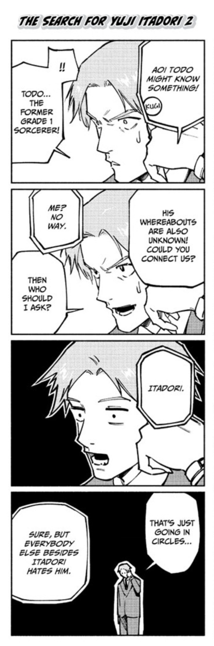 >>285823395Panel 1>Itadori Yuji....!!Panel 2>You're so slow.....!! I have been waiting here for you, you know.>Well then, now you are dead and here with me....!!!Panel 3>That was long~~~ >Hey!! How did you die......>You..... you arent actually dead are you?