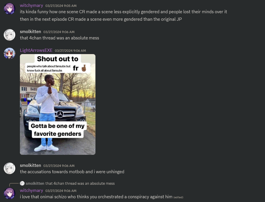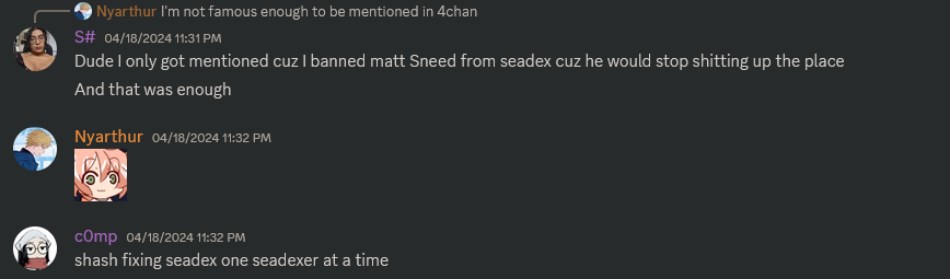 I have never used Seadex and have no idea what it is or what all this autistic drama is about exactlyS# and some of these other names belong to the (DDY?) fansub cartel, which is where groups like Salchow or SobsPlease come fromThis guy posting Discord screenshots is probably that schizo that did a fancy Onimai release and then seethed for some reason I don't remember, I think someone apparently stole their glory on Nyaa or somethingSame guy also worked on a few episodes of Shikanoko before dropping it in an autistic rageIIRC he's just the typesetter or the torrent uploader though, not the translator or anything actually useful