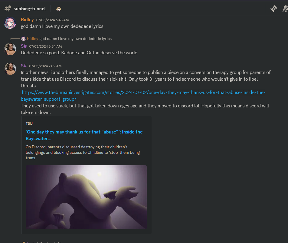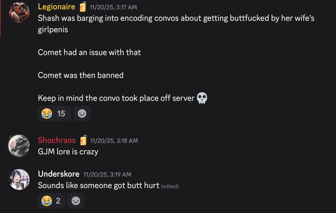 I don't know what's more disturbing, the (supposed) state of their shitcord, or someone saving screencaps and spamming it on /a/.