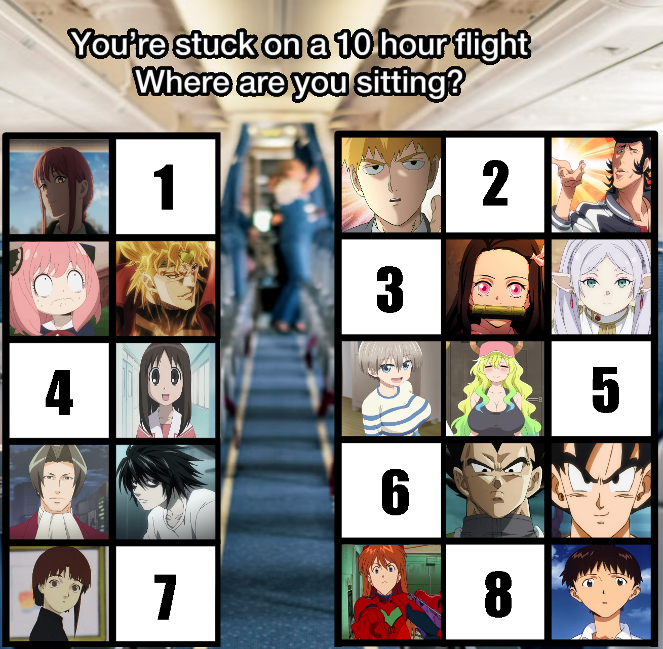 Kind of depends on if it's a "you are on this flight with them, and happen to go to their world with them", or if it's "you each return to your own world, never to see each other again".If the former, I would pick seat 5 to stay in modern earth (japan), or maybe 2 (modern earth, esper japan or space). 3 if I can be assured it's Frieren world and not demonslayer world.If the latter, definitely seat 8 and do my best to provide an impromptu bolstering of their psyche because I love both asuka (romantically) and shinji (no homo). While sitting there I would also at some point say "excuse me for a moment" and lean over Asuka to shout at L that Light is Kira.No one else could possibly be helped by me in the short term and anything I could get out of it wouldn't really matter anyway.5 if it's the latter and I can be in some way assured that 10 hours is enough to learn anything of note ability wise from either Lucoa, Frieren, or the saiyans behind me.