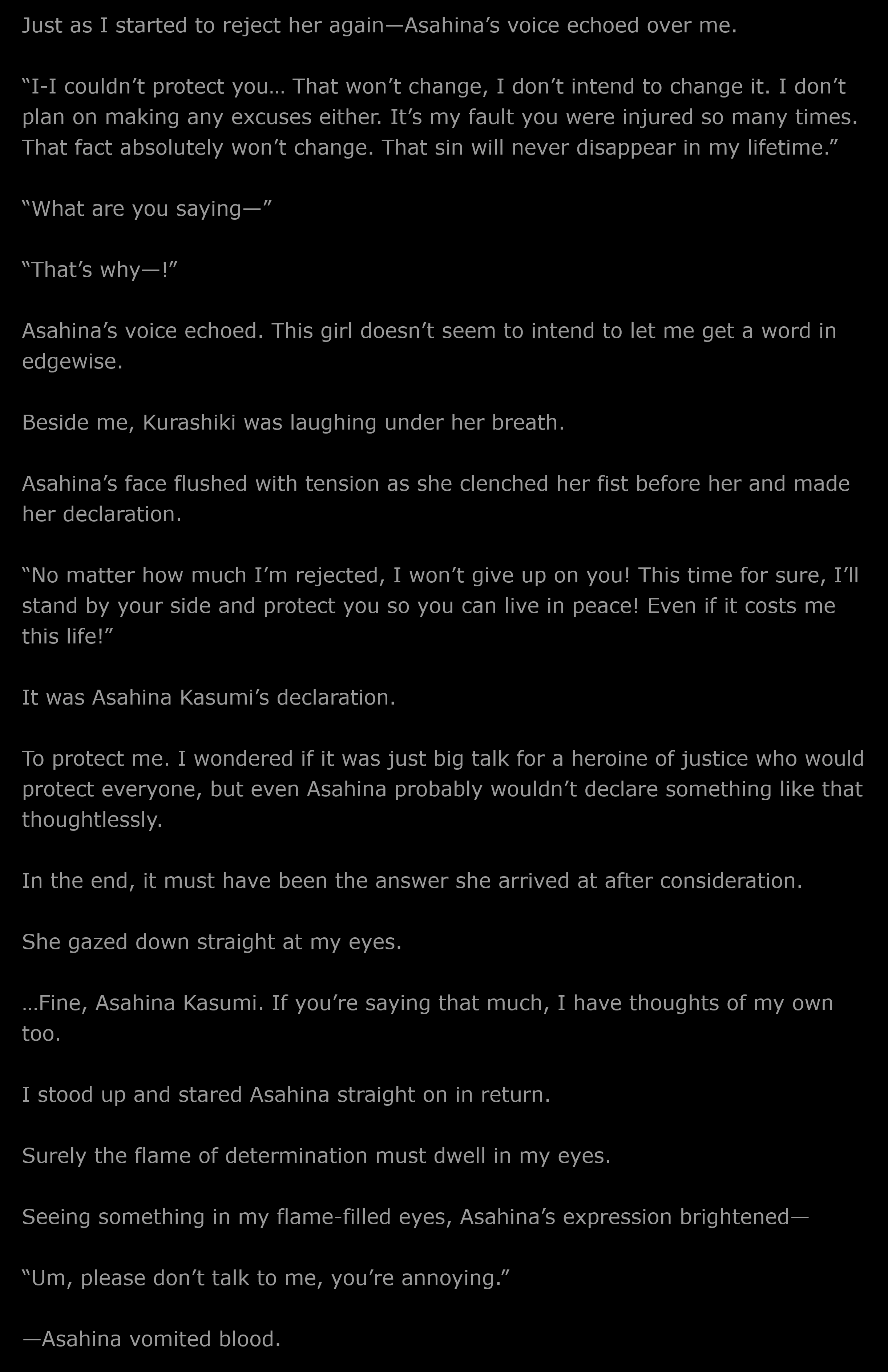 Its weird how MC accepts this situation and doesnt question why the rules are being set in the first place when its quite clear the demon king could have destroyed him, I know a lot more gets revealed later on but its so odd that as meticulous as the MC has been to notice certain things, lamblasting Ash for agreeing to these conditions before he isekai'd into this world for example, you'd think he'd question why an overwhelming force would be willing to make a gentlemen's agreement for a "fair fight."