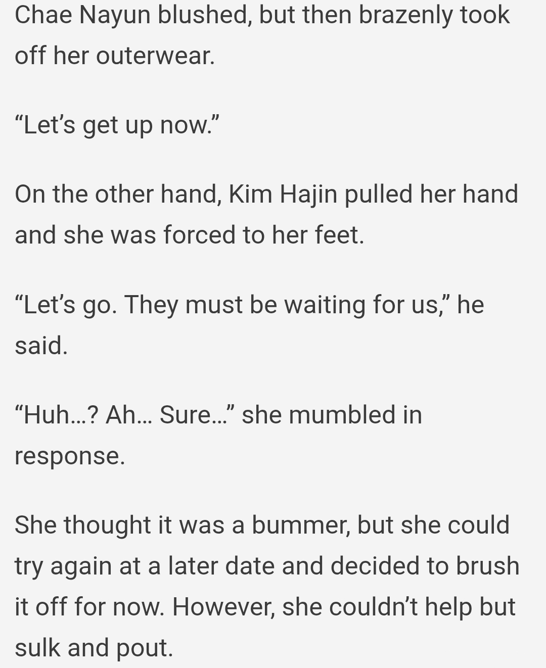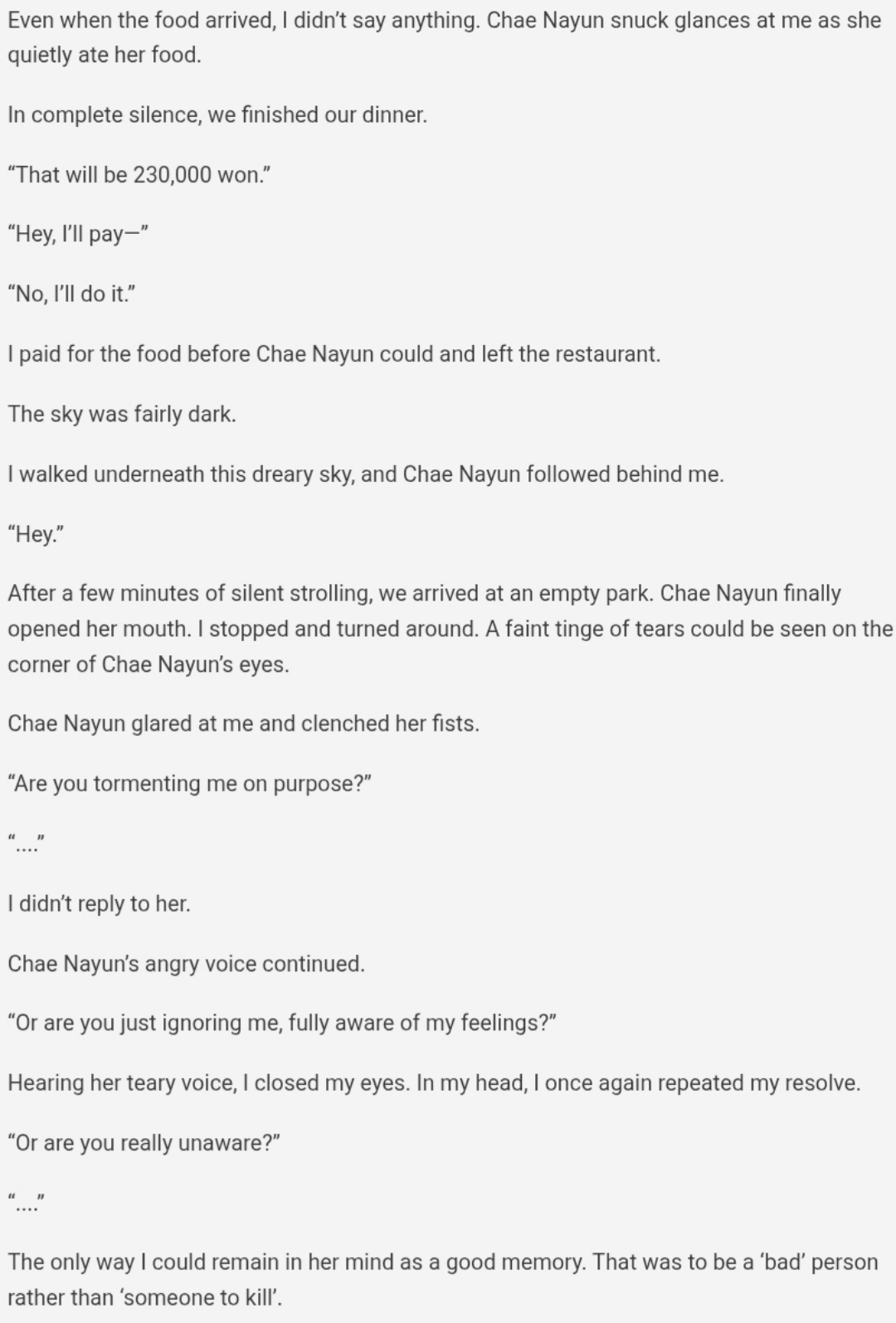 >>285949655>Hajin: “…What.”>Nayun: “Can’t you not go?”>I could only shake my head in response.>Nayun: “Ah, okay, well, if you have to go, you should. I can… I can also find someone else to be my boyfriend.”>She mumbled as she glanced at me.>Hajin: “Yeah, go ahead.”>Nayun: “…I’m kidding. I won’t date anyone else.”>Hajin: “You should.”Holy fuckin shit LMAO