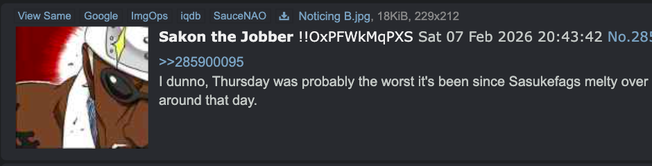 >>285947787>It wouldn't surprise me if Sakon was behind all the homo pic posting to frame Sasukefag.Why do you refer to yourself in 3rd person