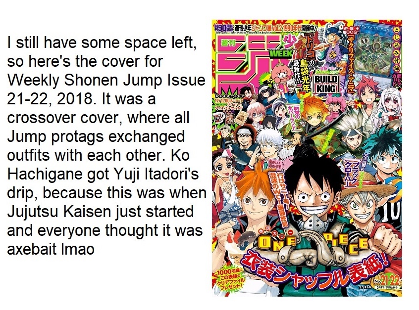 >>285982054That doesn't sound right to me, my main reference for when I started keeping up with jump was Bone Collection and that was 2020, I feel like I had already been reading for a bit when it started, guess it was earlier than I though