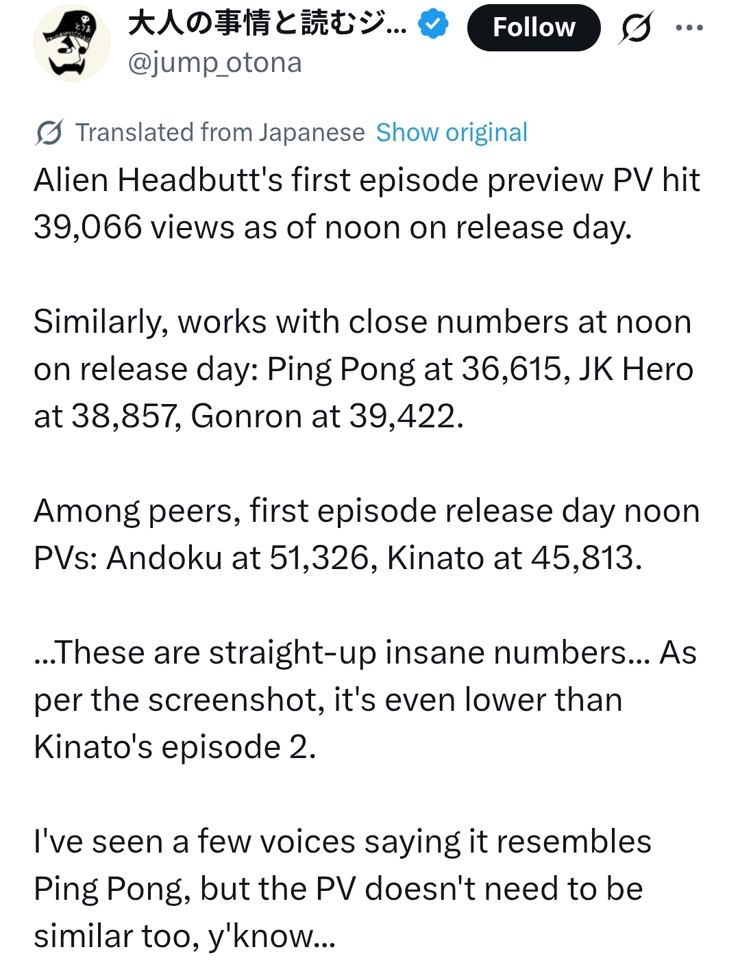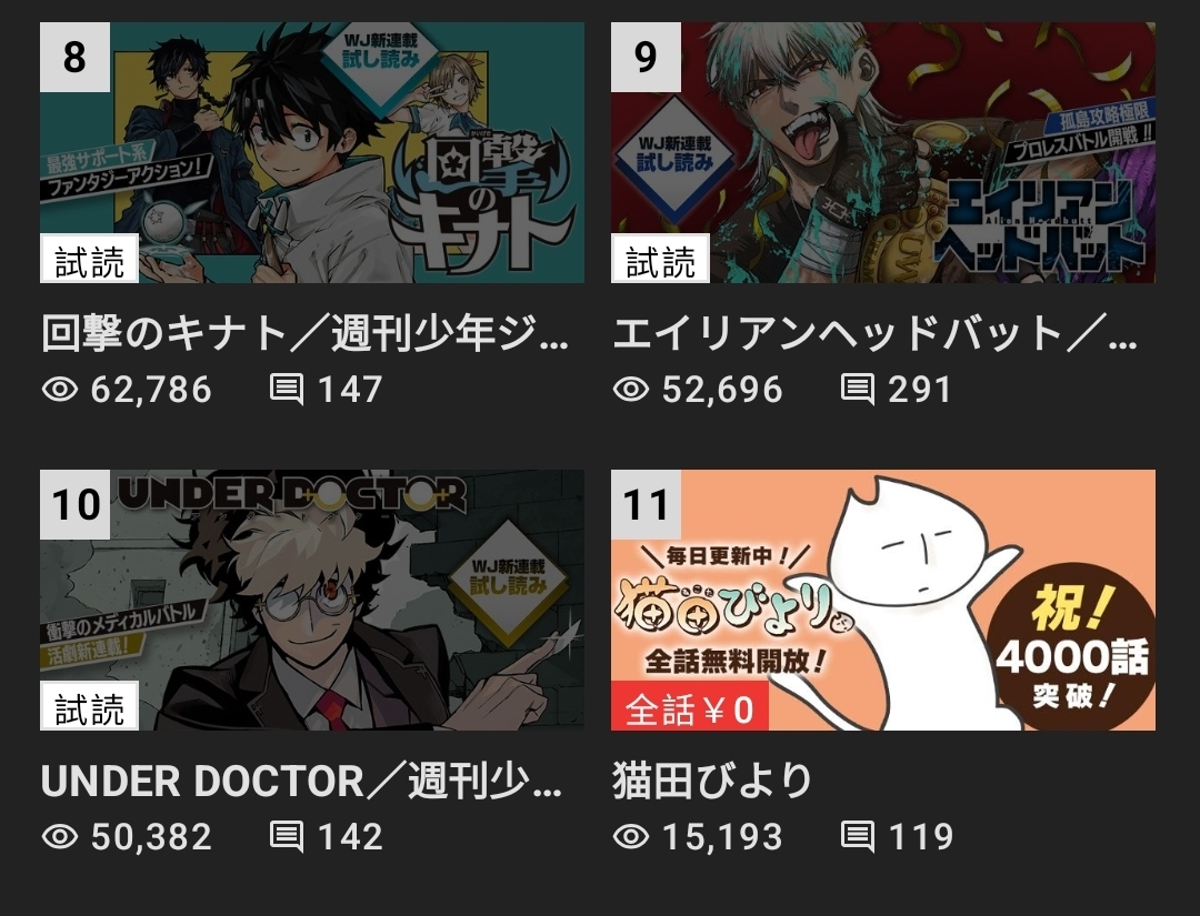 >>285978188Anons are just impatient as fuck and can't wait for the only things that matter which is the toc and sales, all the twitter charts and the jump+ views mean nothing most of the time
