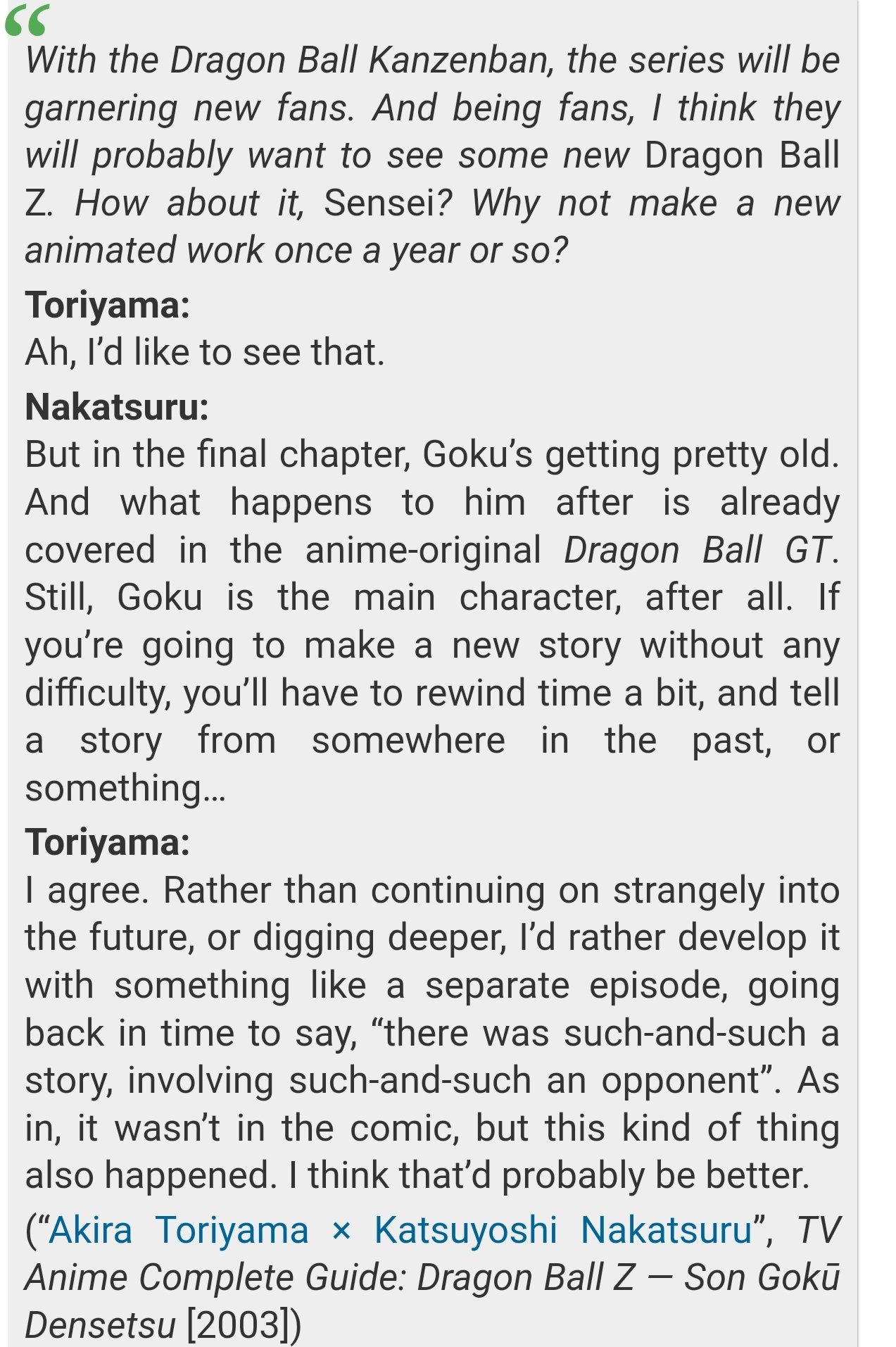 >The way I keep fans hooked on the series is by betraying their expectations, they like bejita? I kill him (raughs) They expect episode by episode for frieza to turn more and more monsterous as his transformations progress? Betrayed expectations.