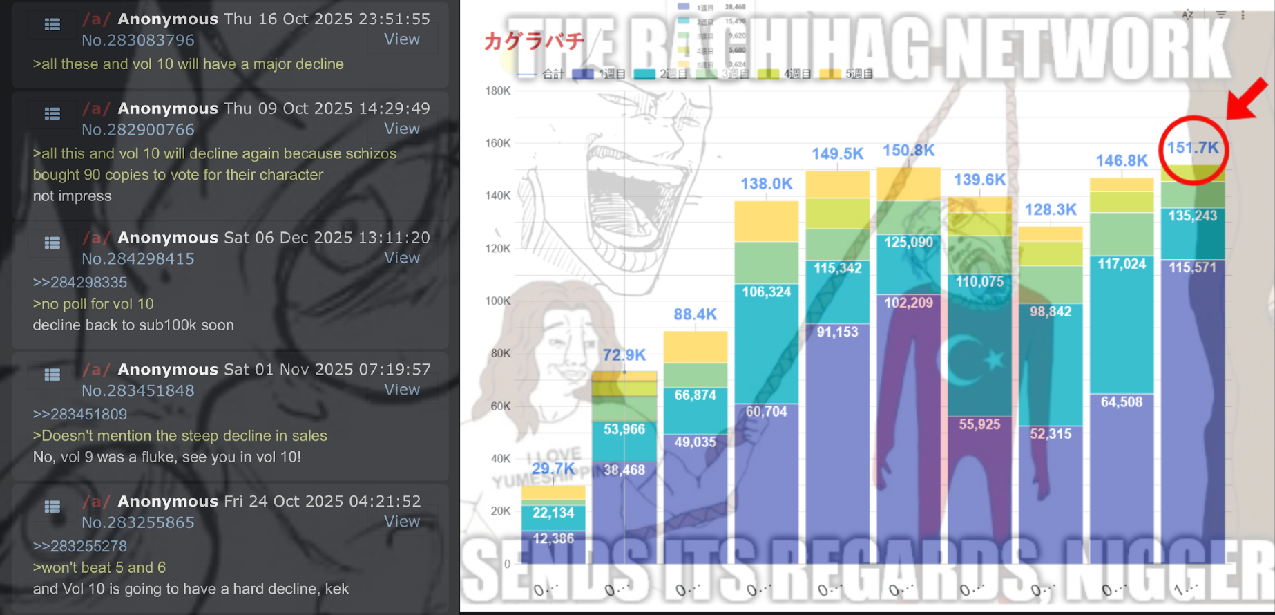 >>285982336Nobody cares about sales but bachifags, see all the charts they post to pretend their stagnating manga is some kind of pillar.They made this a general so they could keep jerking off to numbers and advertise their manga.