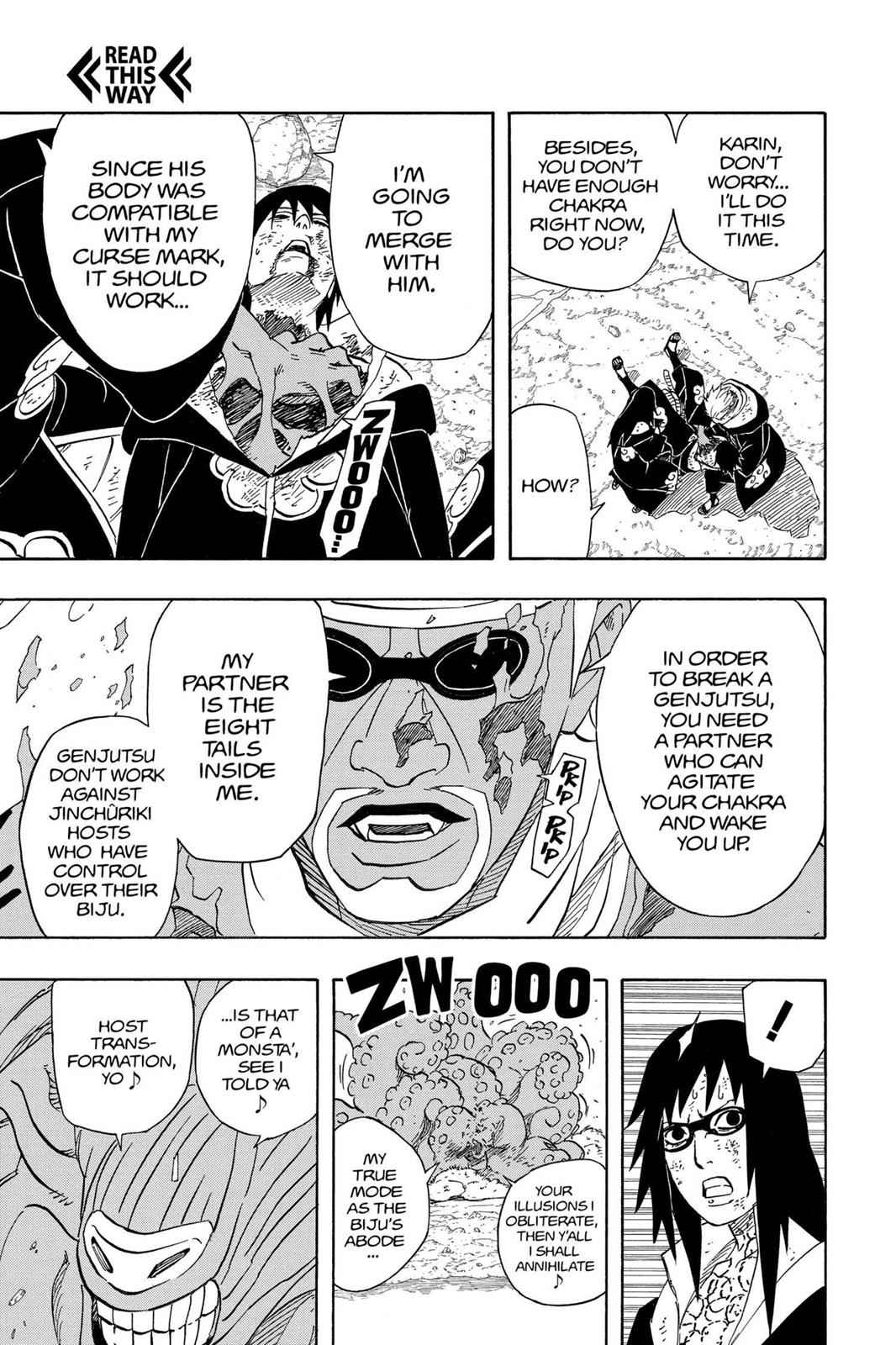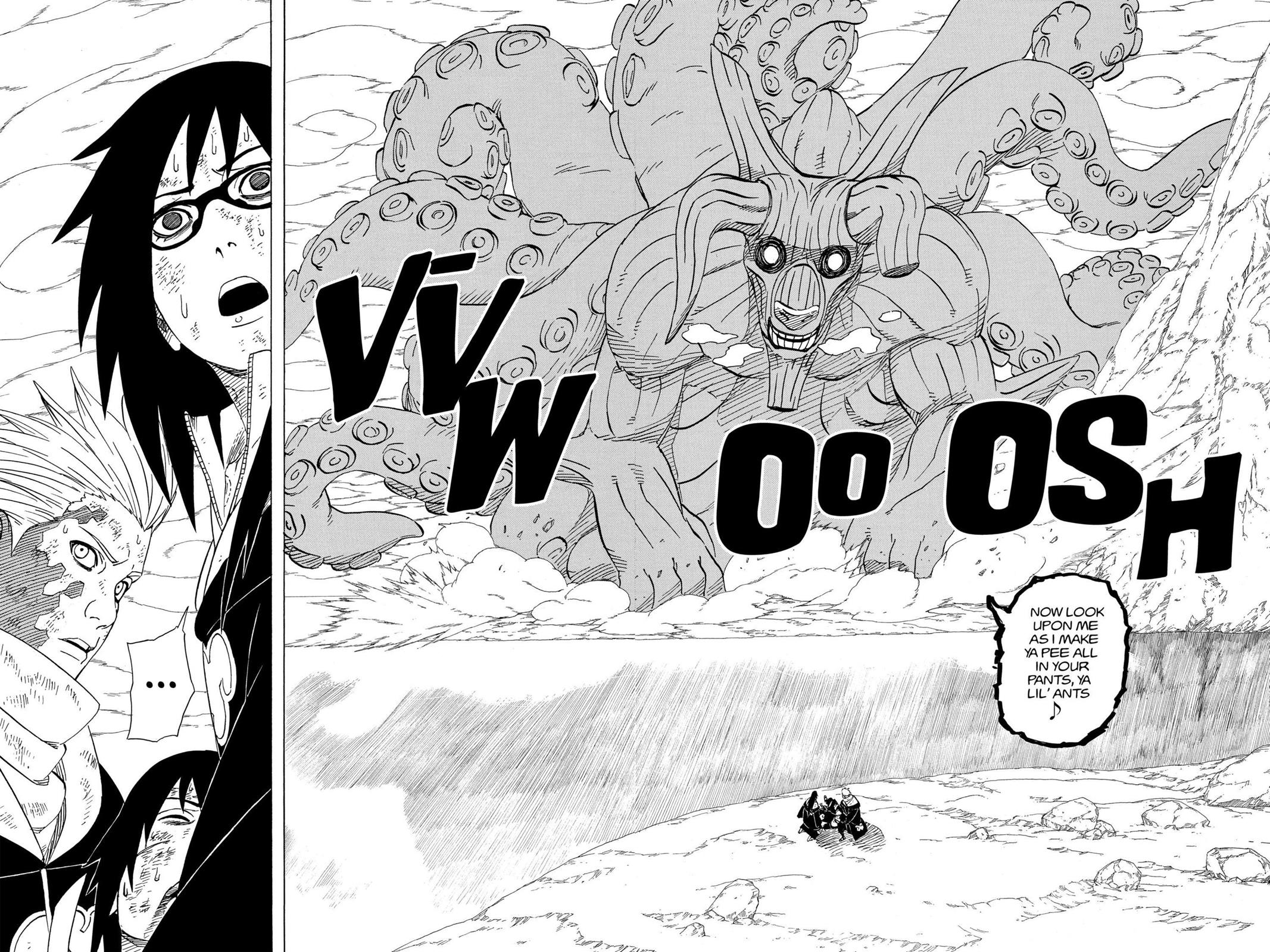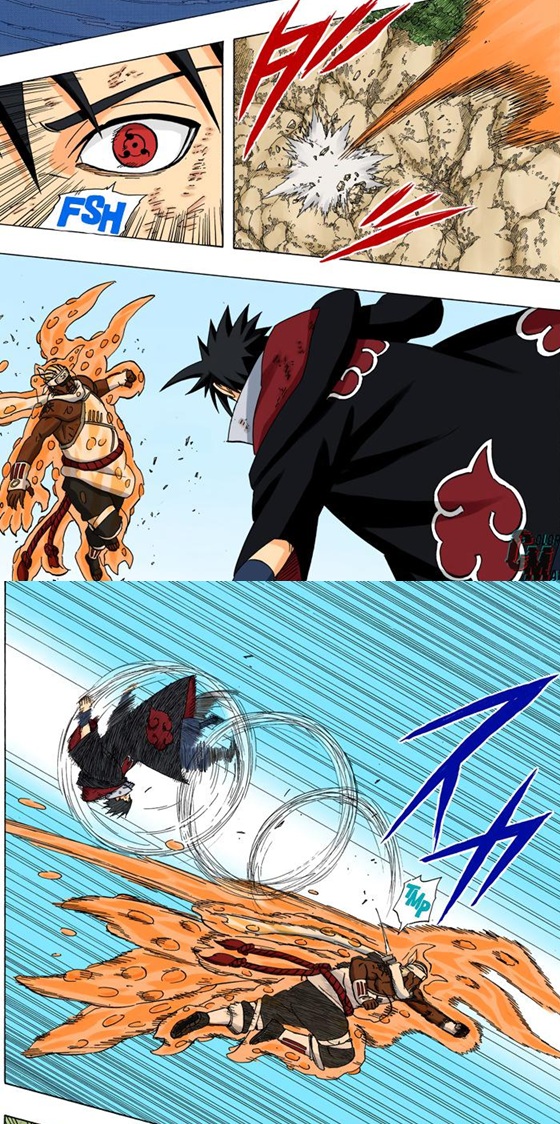 >>285990221Nope. The Chidori + Suigetsu combo stunned him briefly but he was still able to recover and get huge distance from them.>>285990057>...why?I think Kishi just wanted to draw a full Bijuu mode and show off the Bijudama. No in-story reason.