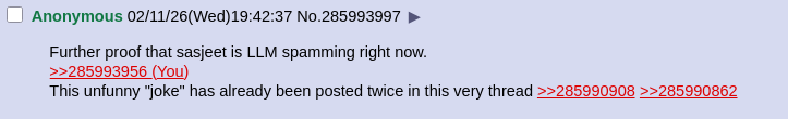 Further proof that sasjeet is LLM spamming right now.>>285993956This unfunny "joke" has already been posted twice in this very thread >>285990908 >>285990862