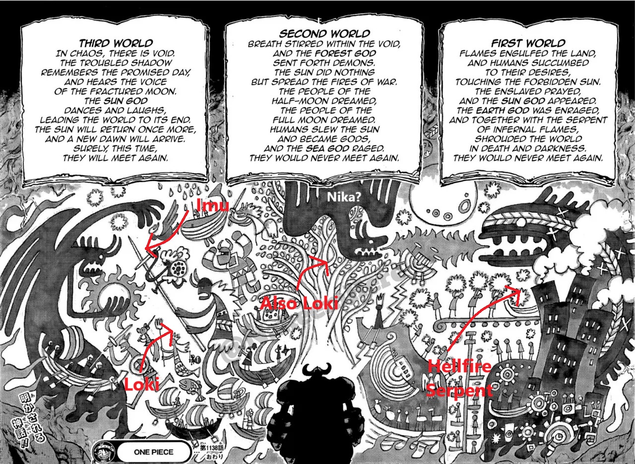 >>286001056From my understanding the sacred fruit of Elbaf (which Loki now has) was likely the same power/fruit that the center dragon in the mural had back during that time.And from the mural we see that only three figures in it are of equal or similar importance.That fire serpent on the left and the figure on the right.So basically Loki with that fruit power is a major player.I however think that to "nerf" Loki Oda will simply have Blackbeard steal his fruit power. The figure in the mural on the right represents Blackbeard in his ultimate form, wielding all his accumulated powers.Also notice how in the mural Loki (posed next to Nika/Luffy) is not in his dragon form, but in his regular appearance.