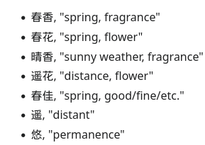 >>286022869Yes. But while 春花 is a word that means "spring flower", it's not pronounced "haruka", but "shunka".