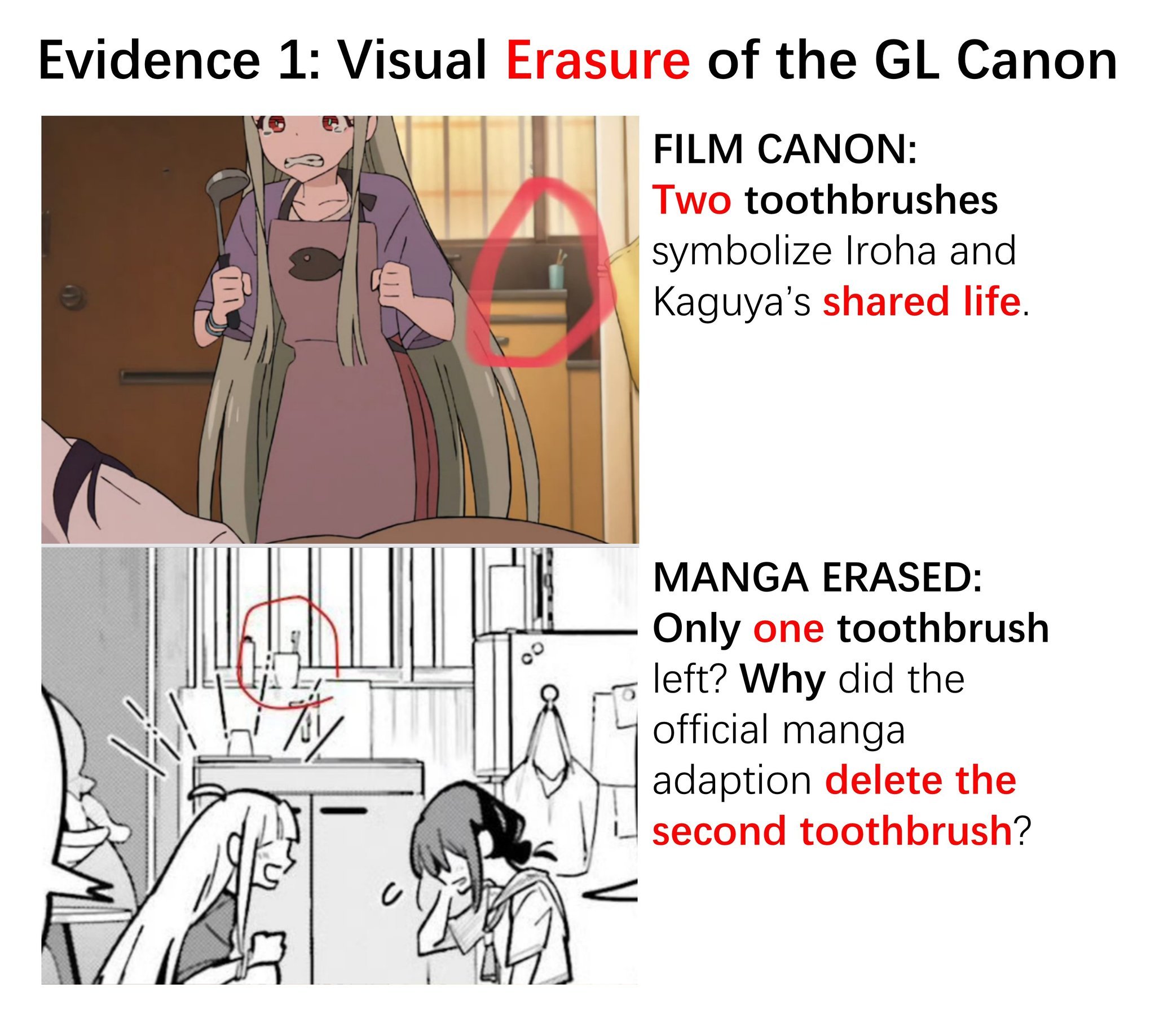 By the way, this vile, yuri-hating mangaka added things like Kaguya holding Iroha's hands while Iroha folds at the beach (movie cuts directly to Iroha on all fours) and them sleeping together before the apartment hunt/Iroha collapsing scene (Iroha is sleeping on her own and yell at Kaguya to stop livestreaming in the movie). Thank god these honest chinese fans decided to harass her.
