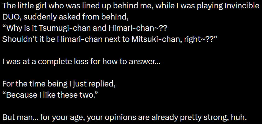>>286132928>By watching Pripara, he could watch the collab movie immediately later.Honestly, kind of a good point. I have the mindset of "no reason to rush" when watching something new, but being able to fully enjoy the new movie by jumping to Pripara is a great draw. >Vibe is irrelevant in this capitalism world.Oh my god I went to go check out the good ole Jewelpet commie dude's blog to grab a reaction pic for this and the poor guy has fallen down the gacha + vtuber rabbithole.
