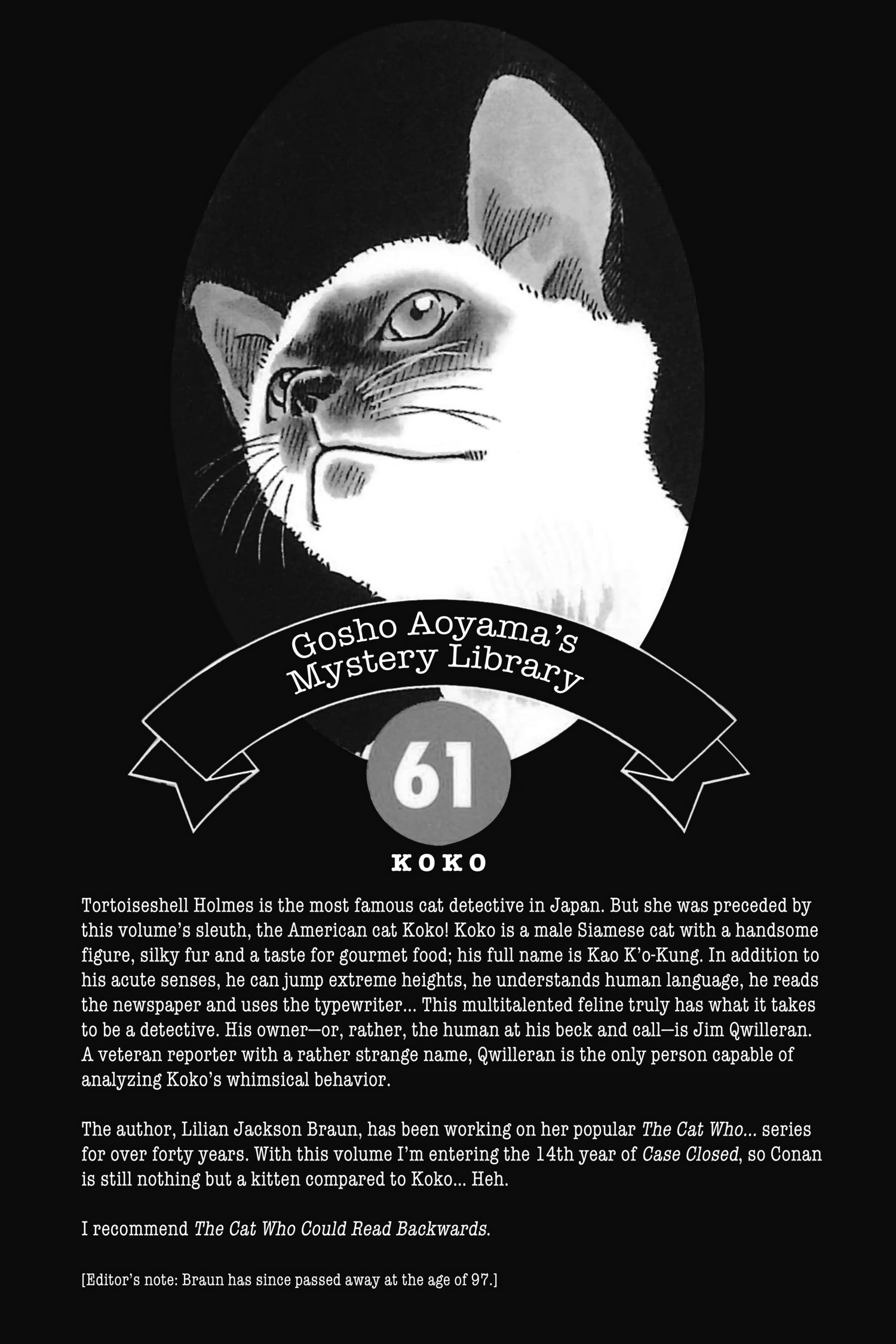>>286162991Possibly, although the cat itself was based on Gosho's own cat Kaito (after divorce taken in by his ex).In the anime the cat is voiced by said ex-wife (Conan's VA), except in movie 10, where it seems to have been voiced by Kaito.