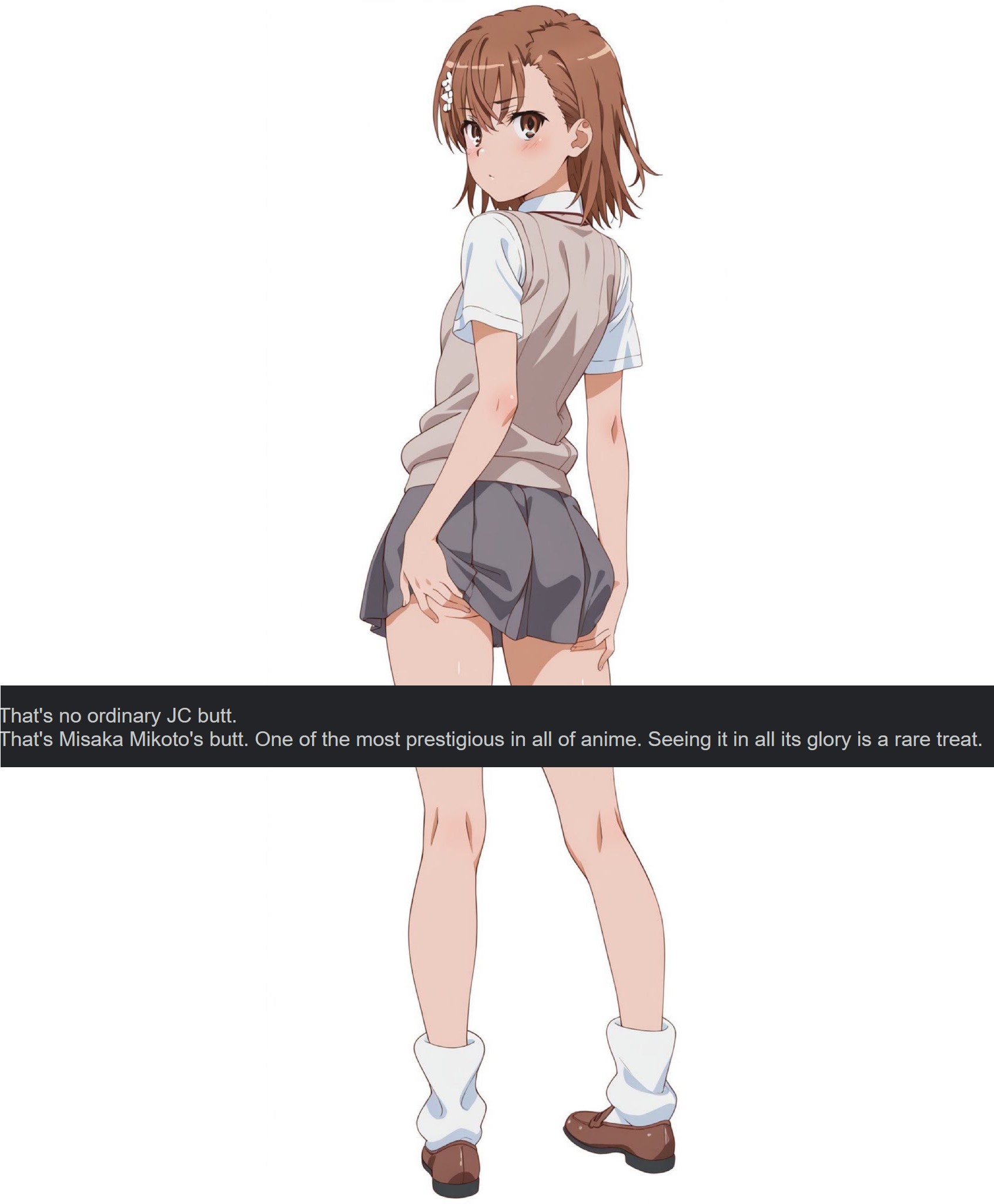 >>286162241She wants to show off her legs but also doesn't want people to think she's a show-off. So she came up with a half measure.