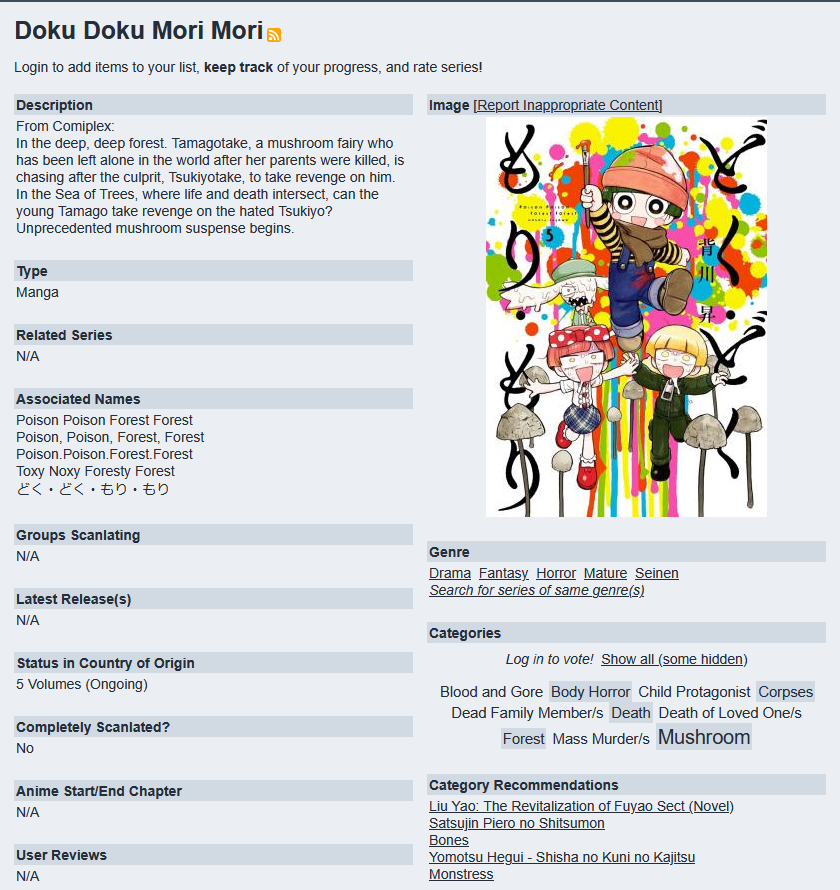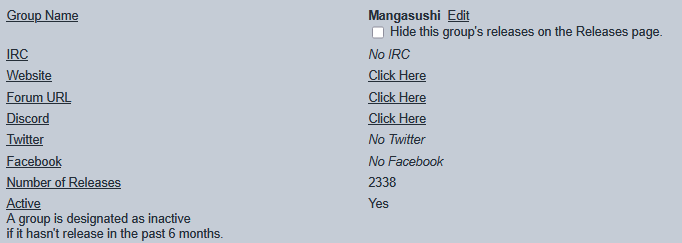 >>286146184MU does not have any scraping and is updated by users. Know a missing release - report it.If a single person has a contact url or irc it qualifies as a group. Discord or mangadex links qualify as contact url.