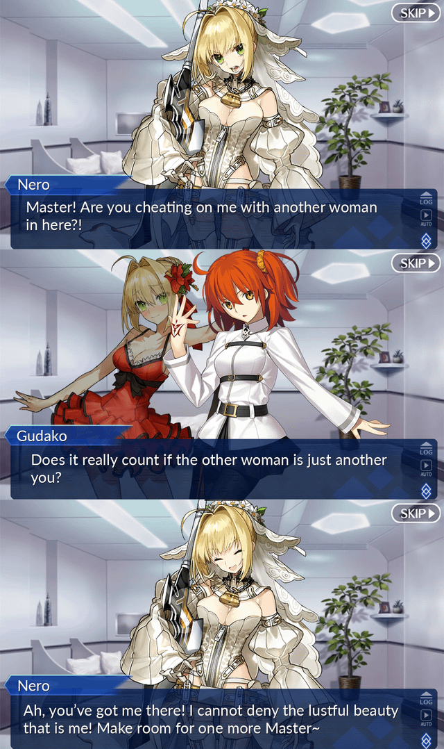 >>286158966Imagine wasting a command spell when Nero immediately gets naked on her own 5 minutes after being summoned