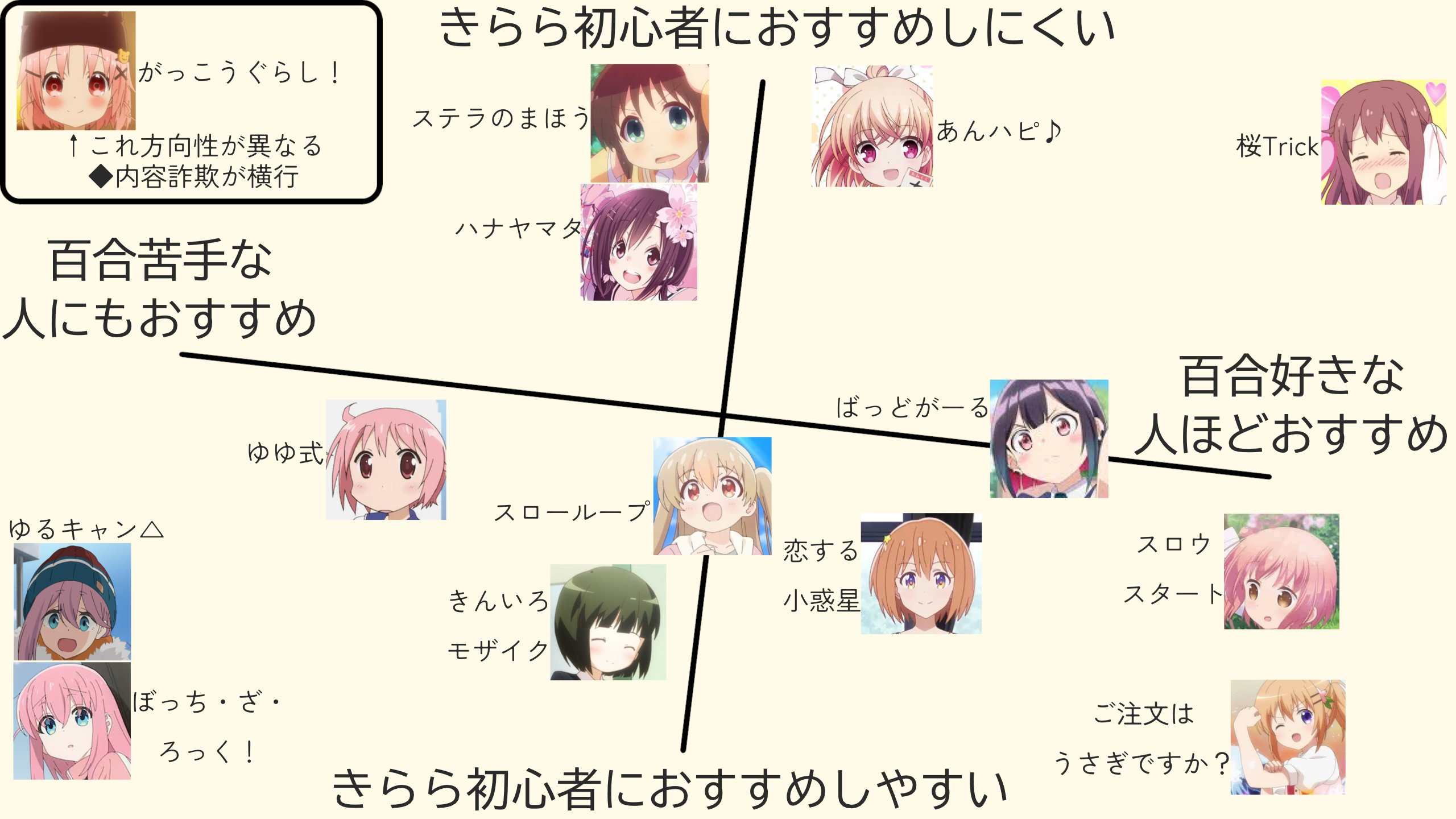 >>286162526>>286162612>>286162716It's not a yuri or not yuri chart, it's a chart with recommendations for people who already like yuri or don't, which of course is very confusing by itself as some series like Gochiusa clearly are enjoyed by both and would make sense in the middle.