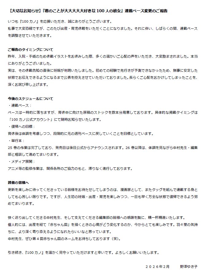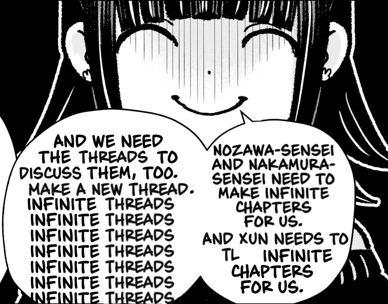 >>286174086>Nozawa decides she wants to take care of her child but also really wants to keep drawing 100kino>Nozawa, Nakamura and editor-kun decide to change its release schedule to monthly >We get somerwhat longer chapters and possibly a little bit of Nozawa's old style as a tradeoffThat'd be the best outcome imo, but a monthly release schedule would make the manga´progress even slower. That, and I'm not sure if Young Jump would be okay with it.