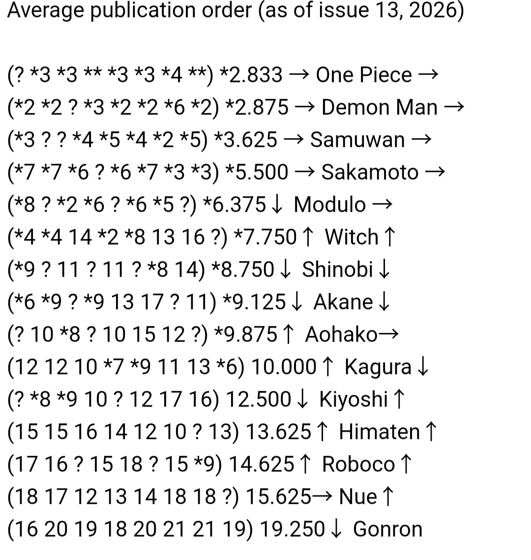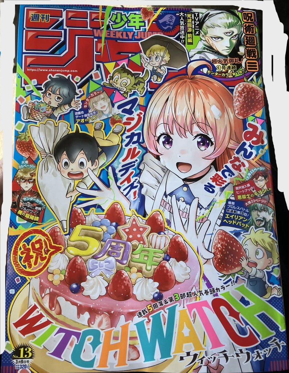 Weekly Shonen Jump Issue #13 (2026)>Witch Watch (Cover & Lead Color Pages, 5th Anniversary)>Ichi the Witch>Sakamoto Days>Jujutsu Kaisen Modulo (Color Page)>Someone Hertz>Kagurabachi>Blue Box (Color Page)>Under Doctor>Me & Roboco>Kinato's Magic>Akane-banashi>Alien Headbutt>Hima-Ten!>Shinobi Undercover>Nue's Exorcist (Color Page)>Ultimate Exorcist Kiyoshi>Hero Girl and Demon Lord Call It Quits>The Mage Next Door>Gonron EggAbsent: One PieceWeekly Shonen Jump Issue #14 (2026) - Information>Ichi the Witch (Cover & Lead Color Pages)>Someone Hertz (Color Page)>Akane Banashi (Color Page)>Jujutsu Kaisen Modulo (Color Page)