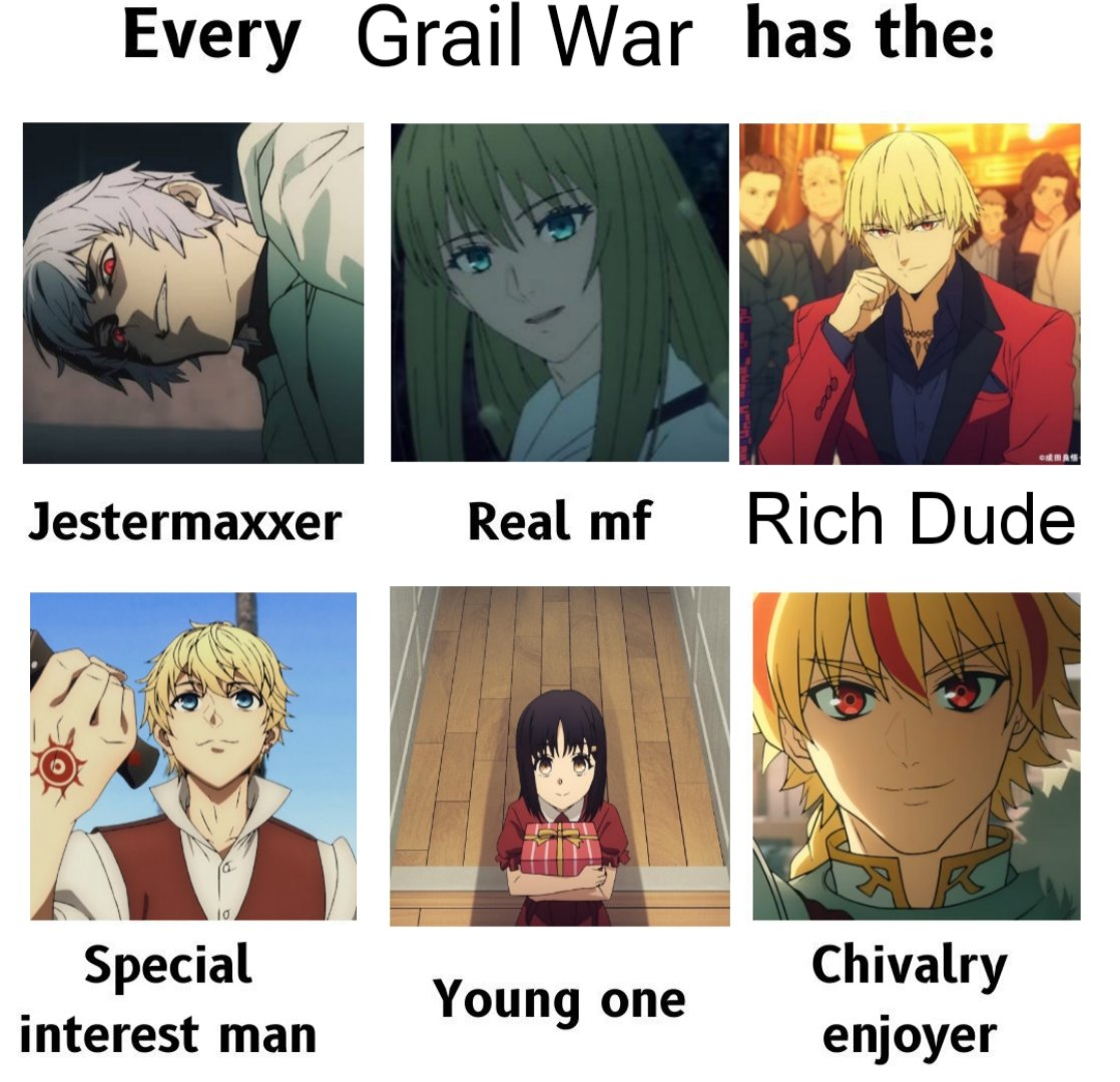 >>286202138>>286200945>The Majority of the human masters in SF are dwarfed by the charisma of their servants>The Majority>Jester (suppose he's not human) vs. Zealot>Rin + Class vs. Hippolyta>Alcides versus Ballsdilate (about equal)>Halri and Ishtar vs. Humbaba>Orlando and Dumas (about equal)>Faldeus and Hassan both being personality voidsThis is only really the case of Saber, Gil and Enkidu, possibly Pale Rider and Watcher. I think it's actually fairly mixed here