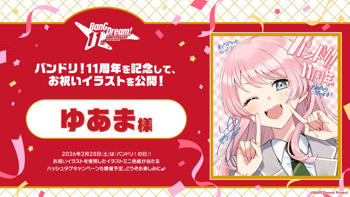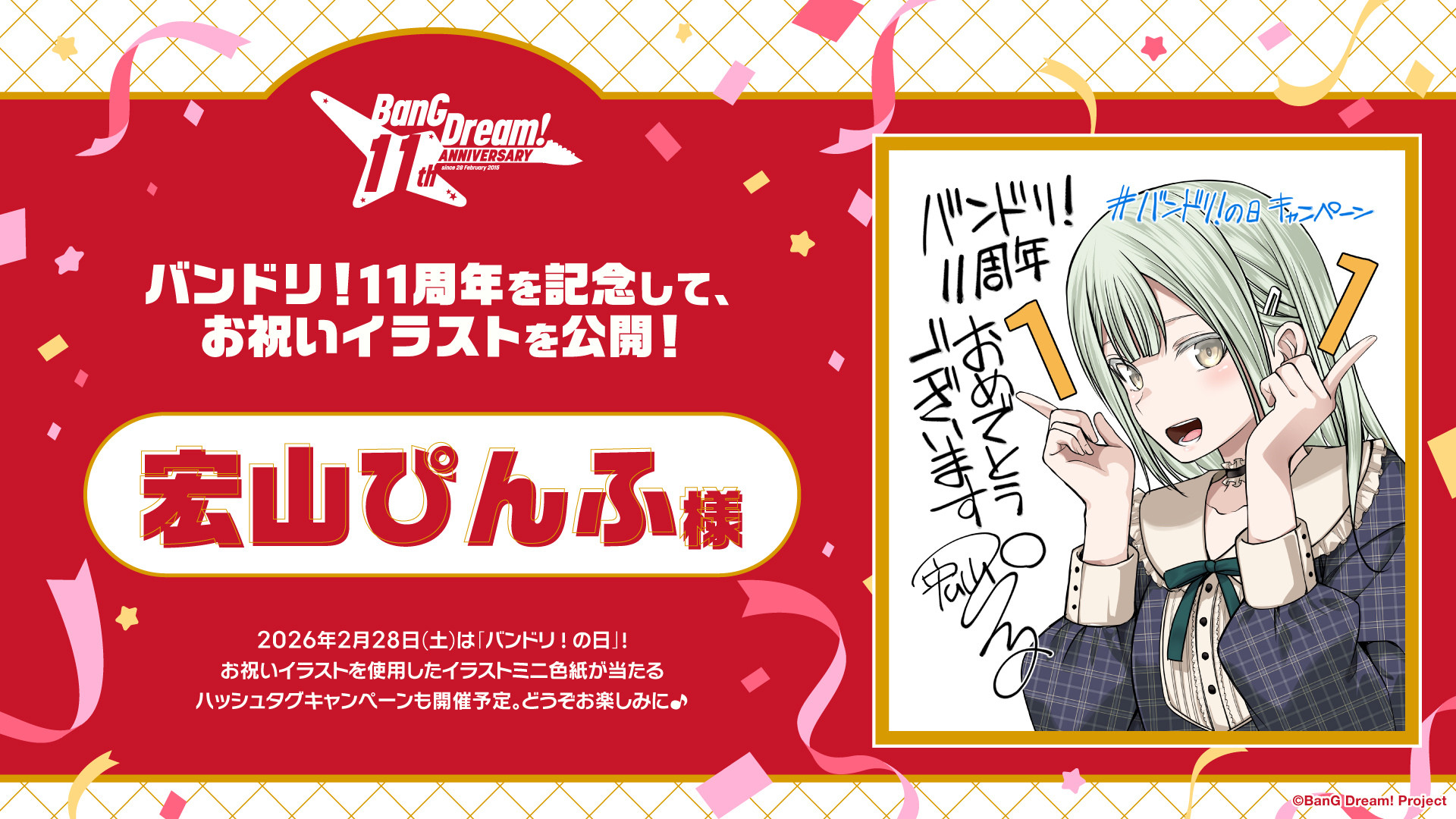 February 28th is Bandori Day and Bandori's 11th anniversary! To celebrate, Pinfu Hiroyama (artist of the manga, Manuscriptus) drew countdown art of Mutsumi