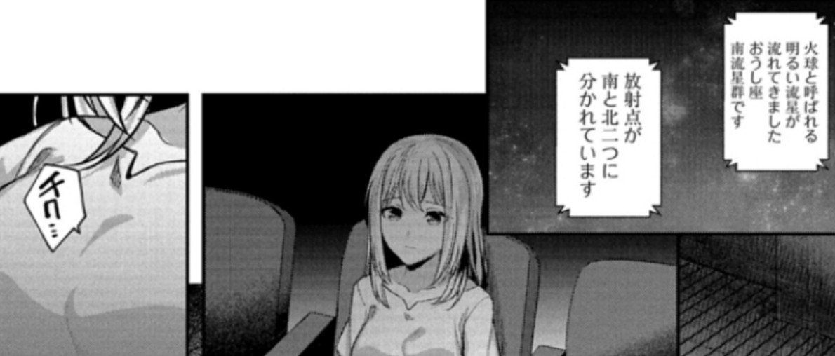 Narrator is talking about the Taurids (Wikipedia: "The Taurids are actually two separate showers, with a Southern and a Northern component.") But it leaves off on "the two separate"... like Uika and Sakiko...