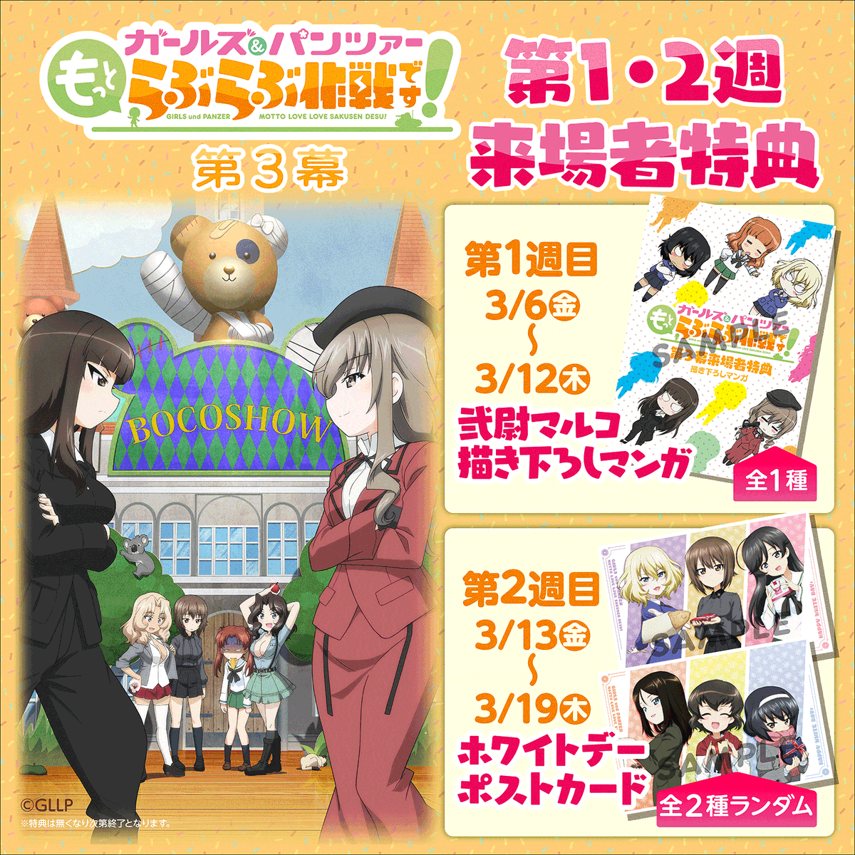 https://x.com/garupan_love2/status/2024771546729132465Act 3 will have an anime original episode again.Title: New Tank Discovered!Synopsis: Yukari and her friends gather to search for a "new tank" hidden beneath the Oarai Girls' Academy ship, and head into an unexplored area deep underground. While being thrown into a dimly lit corridor, a mysterious food stall, and other unexpected occurrences, what will they find in the depths of darkness?