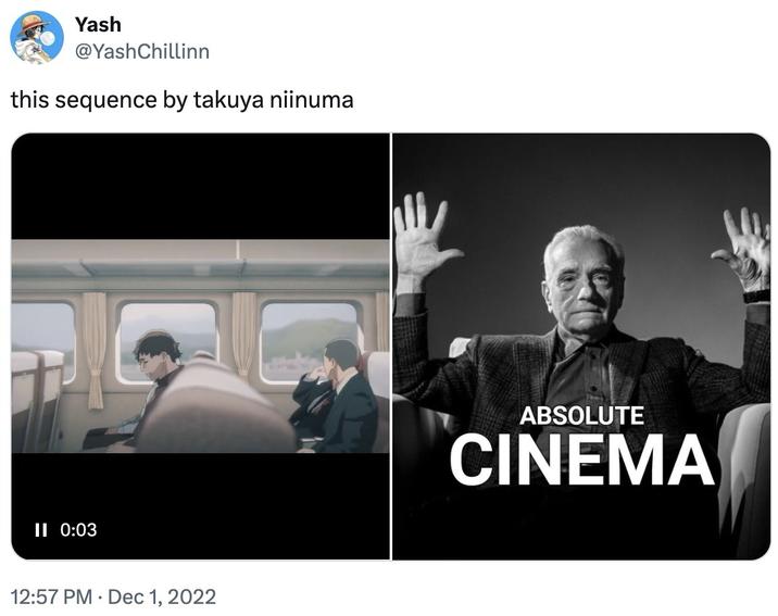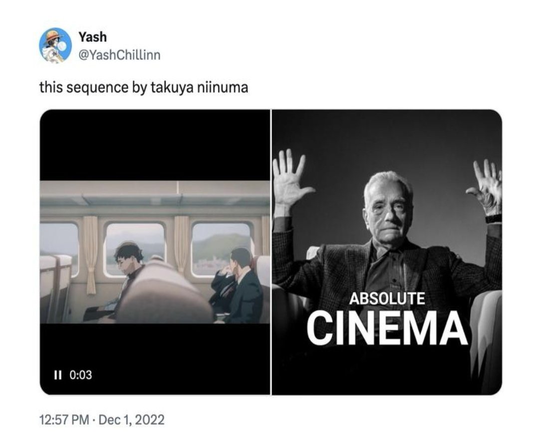 >>286238200>Chat is this true?>On December 1st, 2022, X user @YashChillinn[7] posted a clip from the anime Chainsaw Man next to the image of Scorsese captioned "Absolute Cinema" (shown below).https://knowyourmeme.com/memes/absolute-cinemaSomeone else made the image but the Chainsaw Man tweet blew the meme up signfificantly