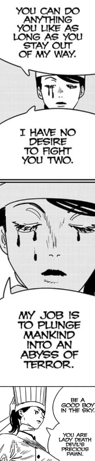 >>286239066Obviously Fire Devil is doing its own thing.>Fakesaw attacked Denji and Yoru>Death Devil gave specific orders to Falling that no harm should come to Denji because he's useful to her