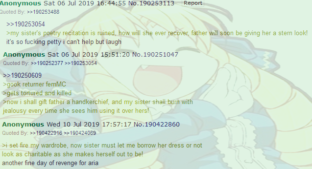 >>286244897It's not even having kids so much as getting out of kitchen duty. She's been trying (and failing) for a decade.>>286244957>girls MC likesHe's explicitly turned off by their promiscuity as soon as he meets them. That's the point; it's a gritty dark fantasy world where monsters act like monsters. They're filthy beasts, not waifus.