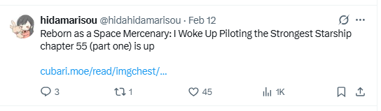 >>286250398>Did Space Mercenary translationsNo. They're caught up. The translator doesn't post to cuckdex anymore so you have to get them off his twitter or wherever.